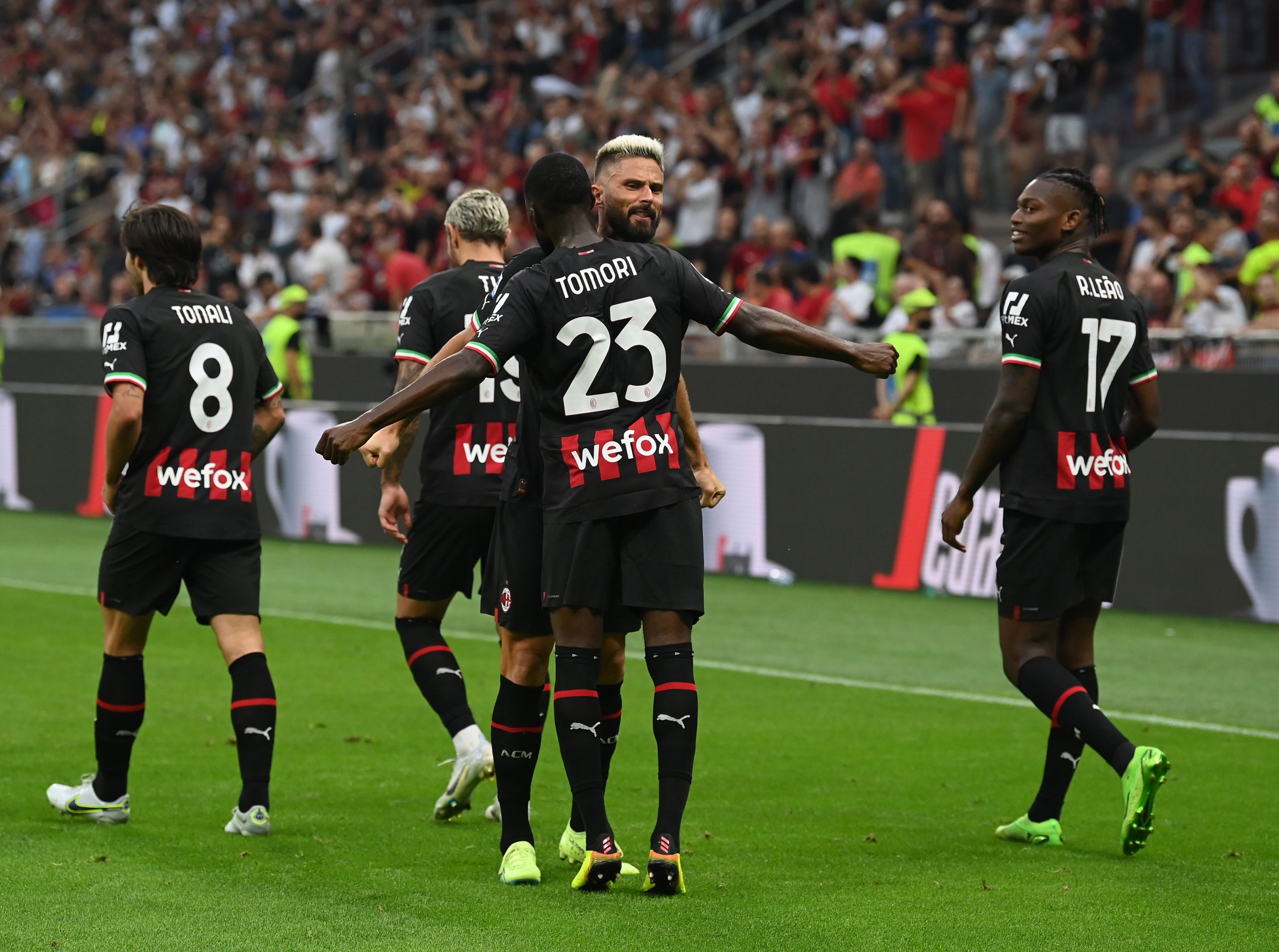 MILAN, ITALY - SEPTEMBER 03: Olivier Giroud of AC Milan celebrates with Fikayo Tomori after scoring the goal during the Serie A match between AC Milan and FC Internazionale at Stadio Giuseppe Meazza on September 03, 2022 in Milan, Italy. (Photo by Claudio Villa/AC Milan via Getty Images)