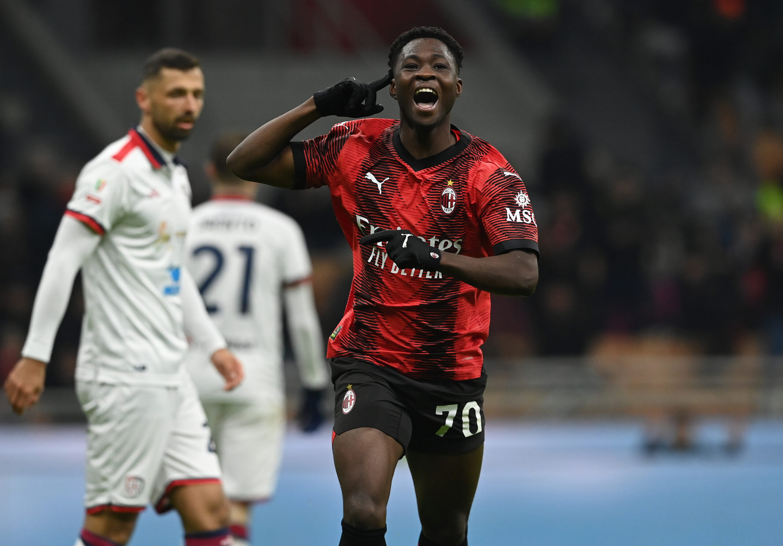 MILAN, ITALY - JANUARY 02: Chaka Traore of AC Milan celebrates after scoring the goal during the Coppa Italia match between AC Milan and Cagliari Calcio on January 02, 2024 in Milan, Italy. (Photo by Claudio Villa/AC Milan via Getty Images)