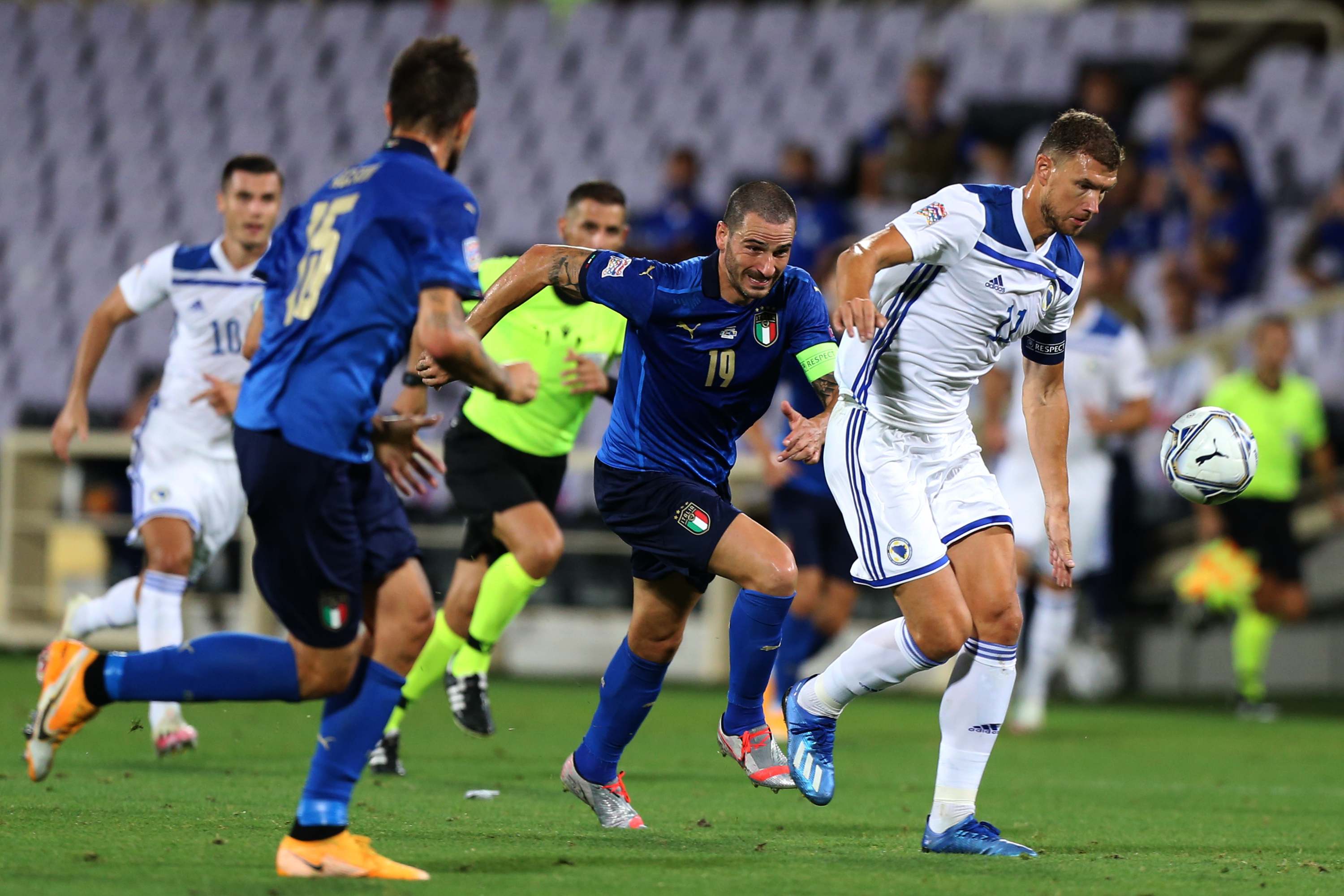 FLORENCE, ITALY - SEPTEMBER 04: Leonardo Bonucci of Italy competes for the ball with Edin Dzeko of Bosnia and Herzegovina during the UEFA Nations League group stage match between Italy and Bosnia and Herzegovina at Artemio Franchi on September 4, 2020 in Florence, Italy. (Photo by Paolo Bruno/Getty Images)