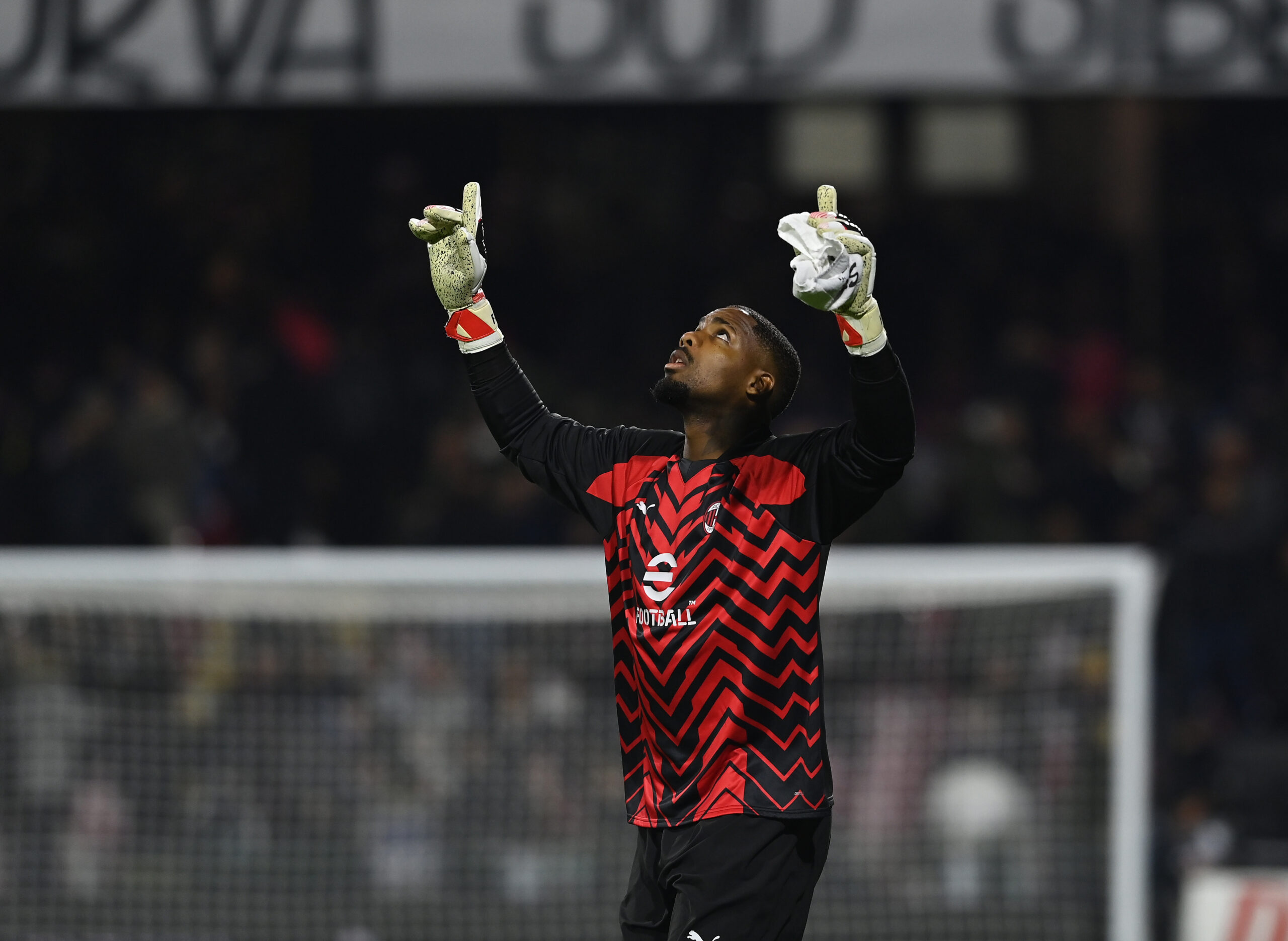 SALERNO, ITALY - DECEMBER 22: Mike Maignan of AC Milan warms up ahead before the Serie A TIM match between US Salernitana and AC Milan at Stadio Arechi on December 22, 2023 in Salerno, Italy. (Photo by Claudio Villa/AC Milan via Getty Images)