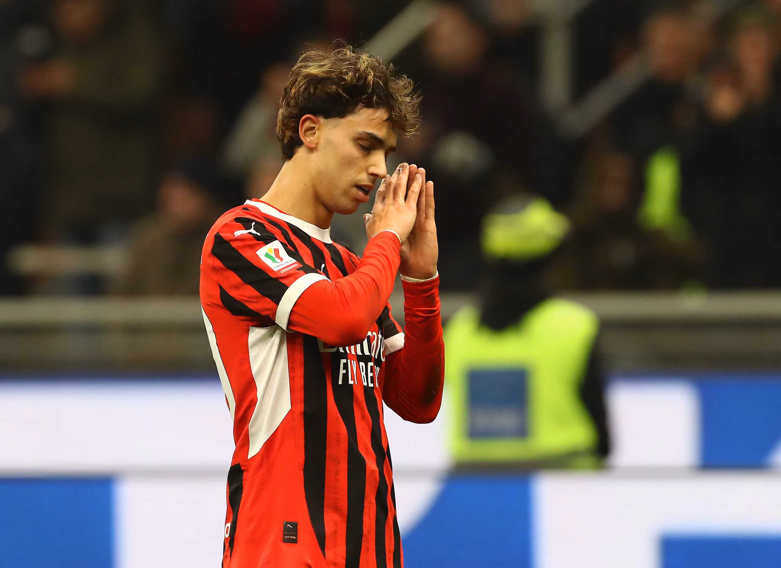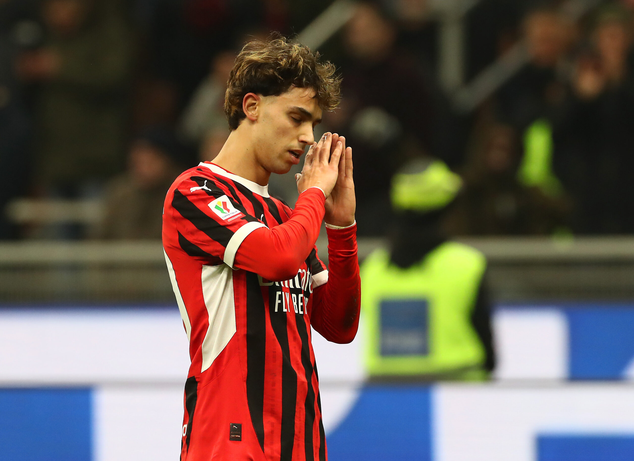 MILAN, ITALY - FEBRUARY 05: Joao Felix of AC Milan celebrates scoring his team's third goal during the Coppa Italia Quarter Final match between AC Milan and AS Roma at Stadio Giuseppe Meazza on February 05, 2025 in Milan, Italy. (Photo by Marco Luzzani/Getty Images)
