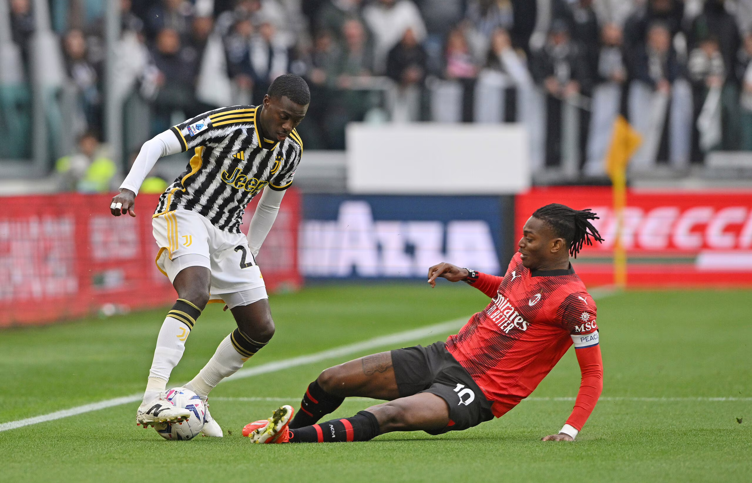 TURIN, ITALY - APRIL 27: Timothy Weah of Juventus fights for the ball with Rafael Leao of AC Milan during the Serie A TIM match between Juventus and AC Milan at Allianz Stadium on April 27, 2024 in Turin, Italy. (Photo by Chris Ricco - Juventus FC/Juventus FC via Getty Images)