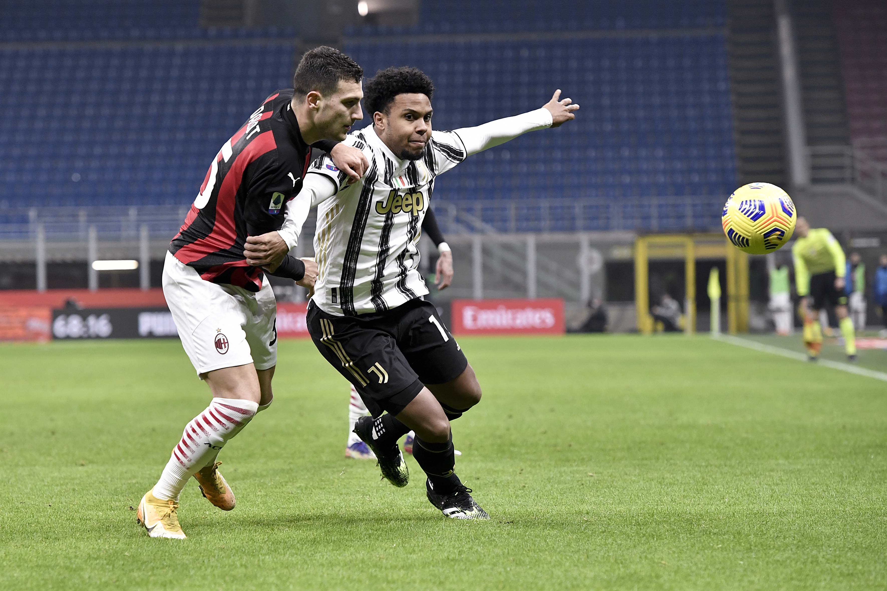 MILAN, ITALY - JANUARY 06: Weston McKennie of Juventus fights for the ball with Diogo Dalot of AC Milan during the Serie A match between AC Milan and Juventus at Stadio Giuseppe Meazza on January 06, 2021 in Milan, Italy. Sporting stadiums around Italy remain under strict restrictions due to the coronavirus pandemic as government social distancing laws prohibit fans inside venues resulting in games being played behind closed doors. (Photo by Daniele Badolato - Juventus FC/Juventus FC via Getty Images)