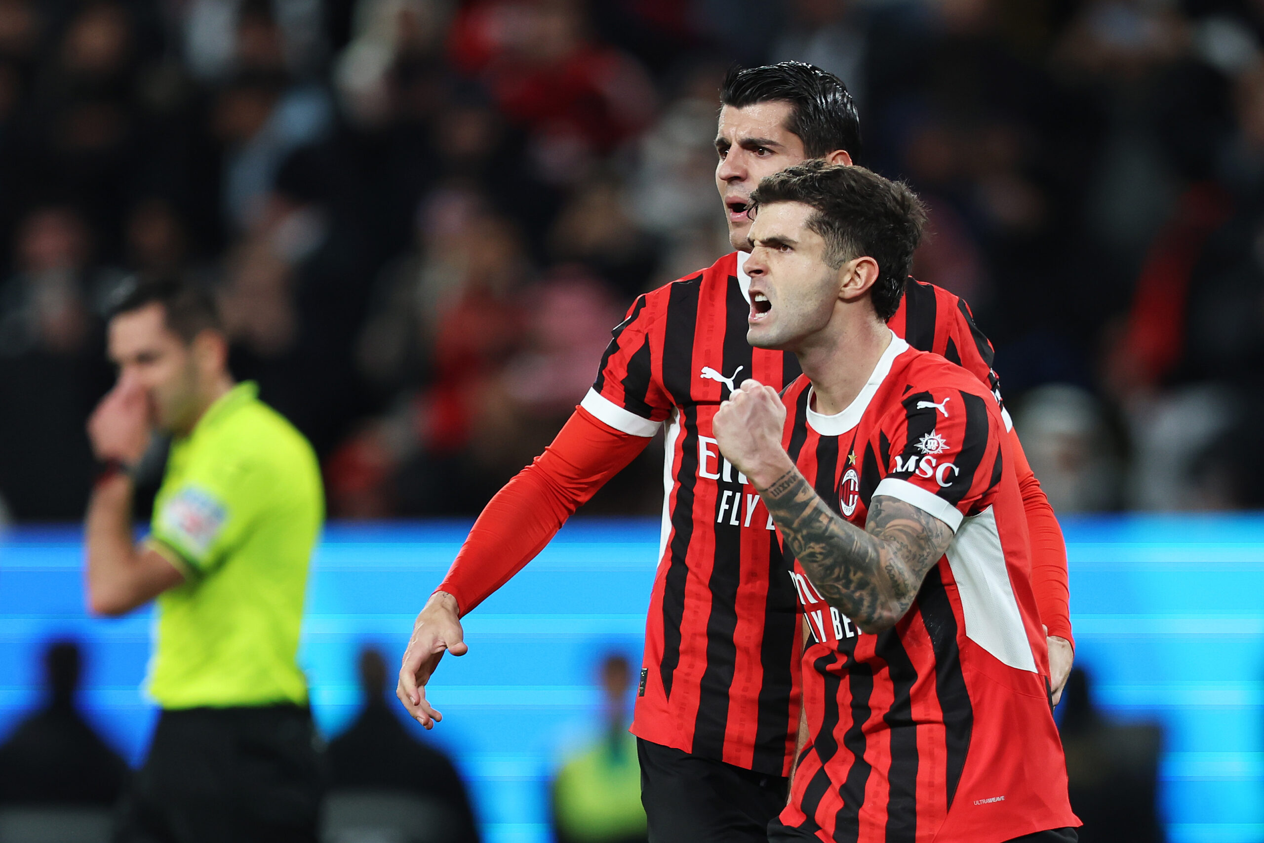 RIYADH, SAUDI ARABIA - JANUARY 03: Christian Pulisic of AC Milan celebrates scoring his team's first goal from a penalty kick with teammate Alvaro Morata during the Italian Super Cup Semi-Final match between AC Milan and Juventus at Al Awwal Park on January 03, 2025 in Riyadh, Saudi Arabia. (Photo by Yasser Bakhsh/Getty Images)