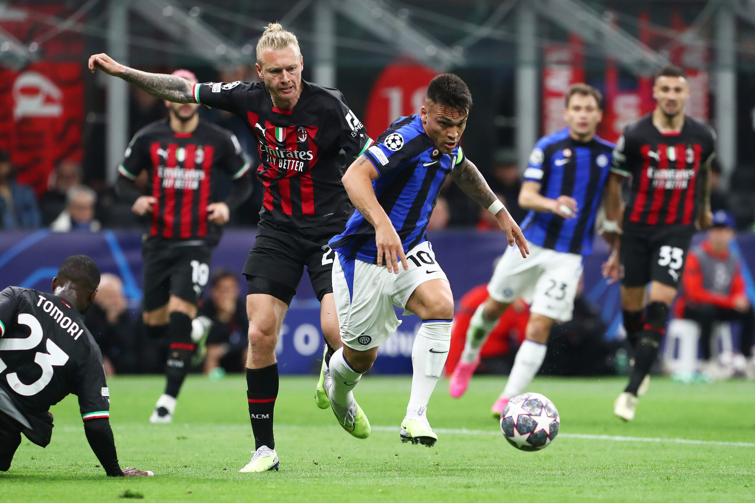 MILAN, ITALY - MAY 10: Lautaro Martinez of FC Internazionale is tackled by Simon Kjaer of AC Milan, which results in a VAR Review for a potential Penalty incident, during the UEFA Champions League semi-final first leg match between AC Milan and FC Internazionale at San Siro on May 10, 2023 in Milan, Italy. (Photo by Marco Luzzani/Getty Images)