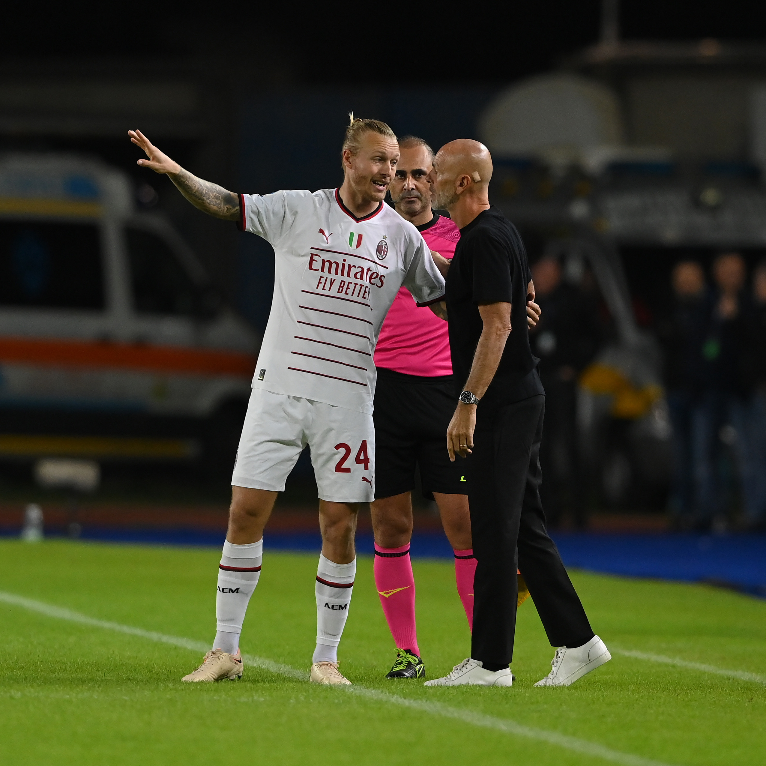EMPOLI, ITALY - OCTOBER 01: Head coach of AC Milan Stefano Pioli speaks with Simon Kjaer during the Serie A match between Empoli FC and AC MIlan at Stadio Carlo Castellani on October 01, 2022 in Empoli, Italy. (Photo by Claudio Villa/AC Milan via Getty Images)