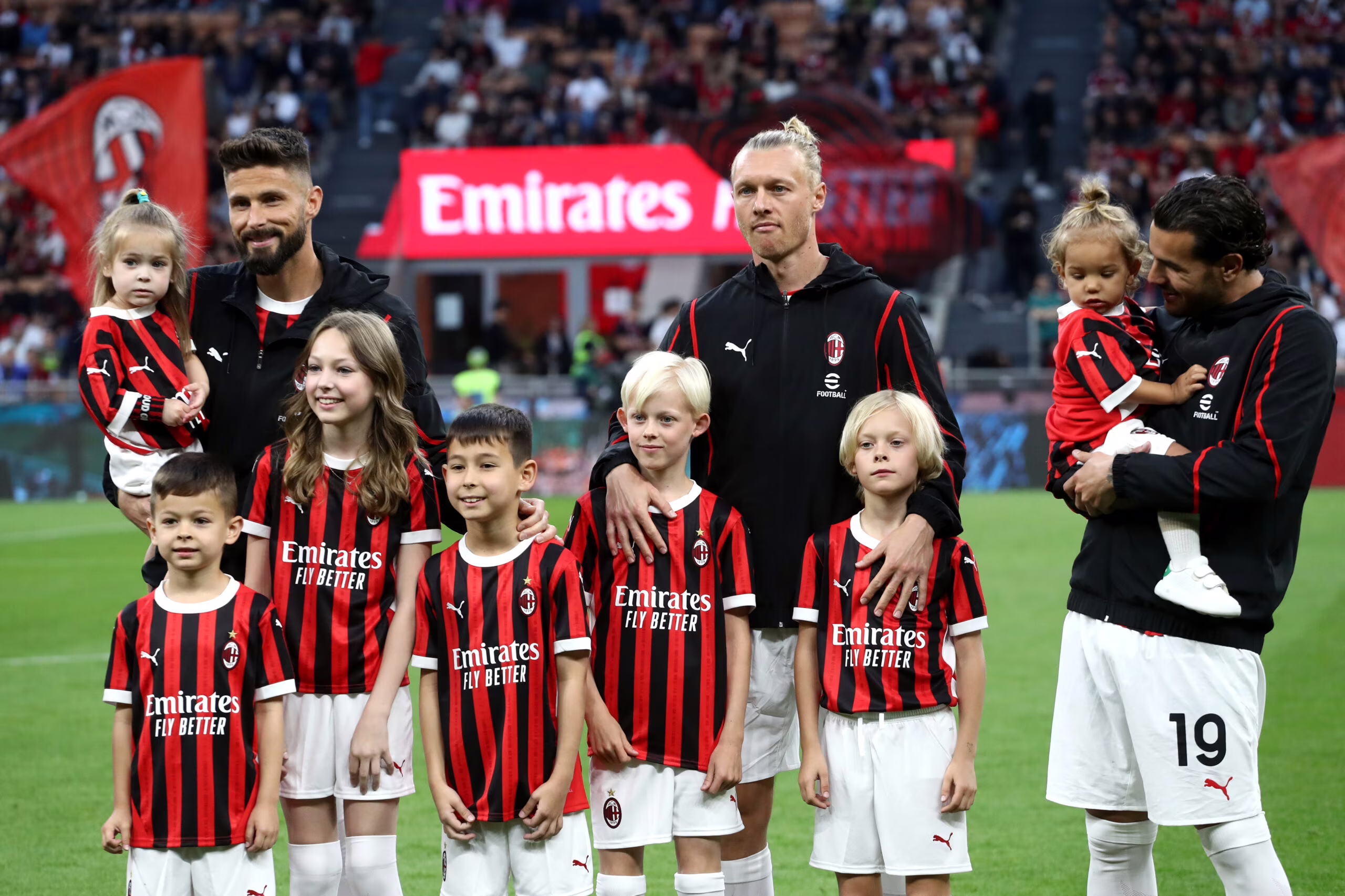 MILAN, ITALY - MAY 25: Olivier Giroud and Simon Kjaer and Theo Hernandez of AC Milan lineup with their children prior to the Serie A TIM match between AC Milan and US Salernitana at Stadio Giuseppe Meazza on May 25, 2024 in Milan, Italy. (Photo by Marco Luzzani/Getty Images)