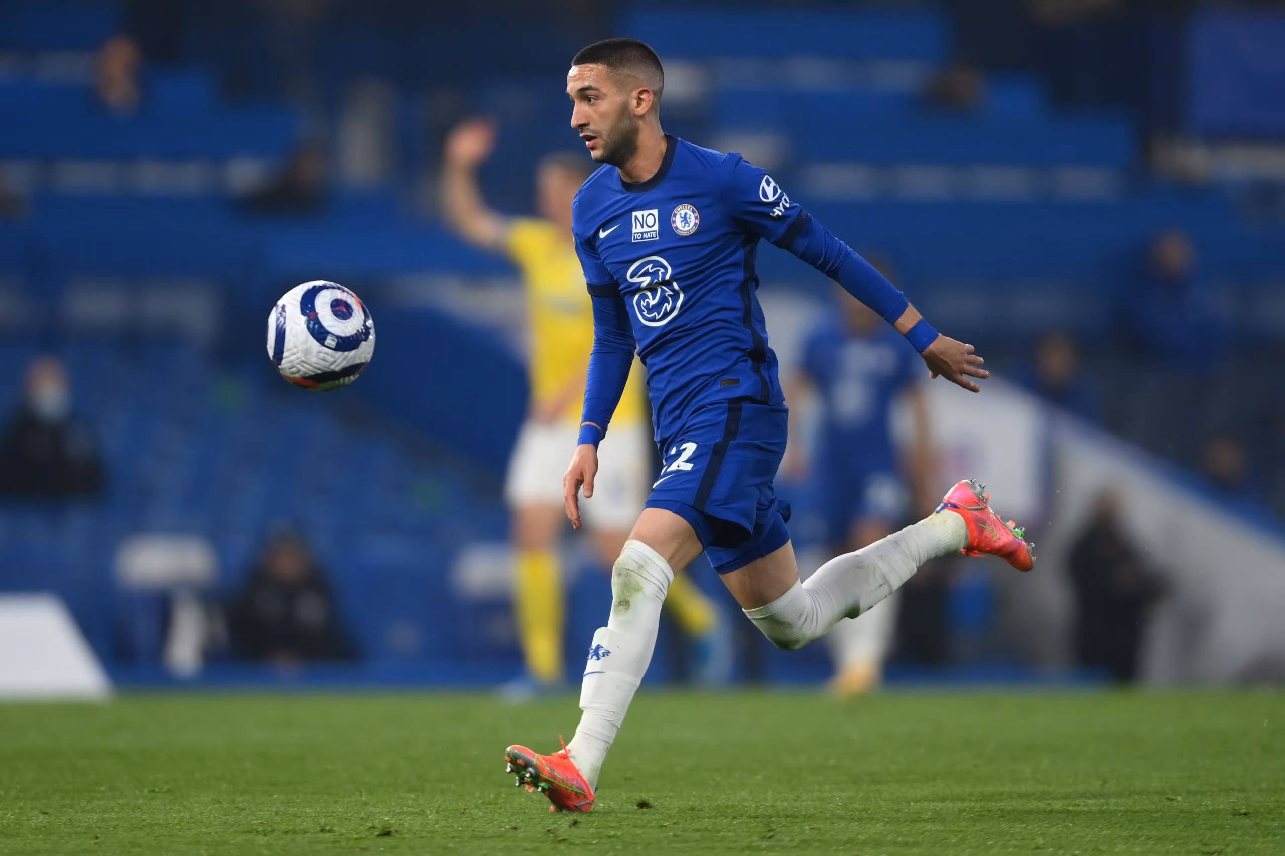 LONDON, ENGLAND - APRIL 20: Hakim Ziyech of Chelsea in action during the Premier League match between Chelsea and Brighton & Hove Albion at Stamford Bridge on April 20, 2021 in London, England. Sporting stadiums around the UK remain under strict restrictions due to the Coronavirus Pandemic as Government social distancing laws prohibit fans inside venues resulting in games being played behind closed doors. (Photo by Mike Hewitt/Getty Images)