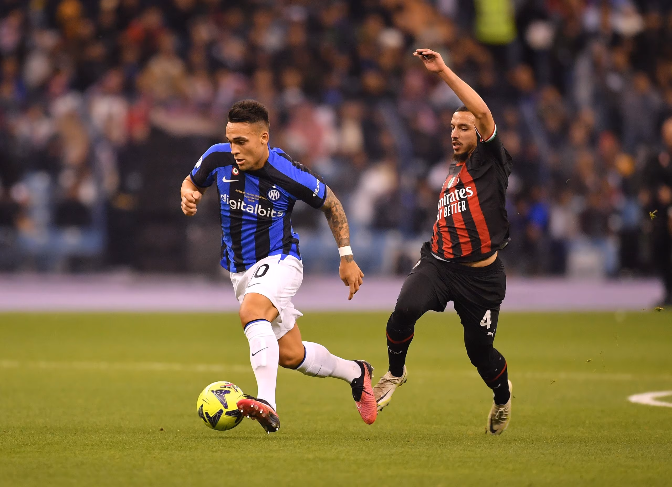 RIYADH, SAUDI ARABIA - JANUARY 18: Lautaro Martinez of FC Internazionale is challenged by m4during the EA Sports Supercup match between AC Miland and FC Internazionale at King Fahd International Stadium on January 18, 2023 in Riyadh, Saudi Arabia. (Photo by Mattia Pistoia - Inter/Inter via Getty Images)