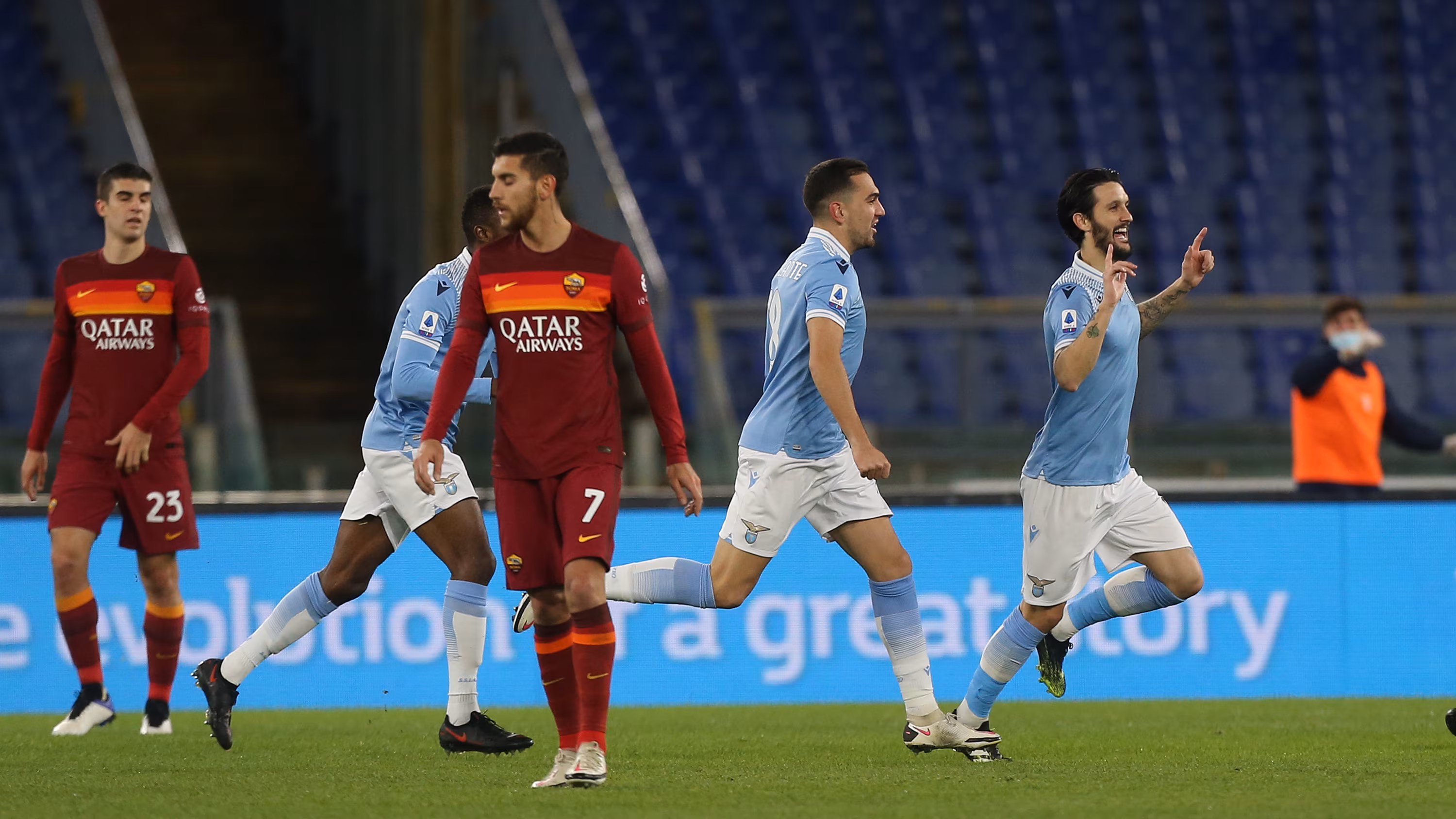 Luis Alberto della Lazio festeggia davanti ad uno sconsolato Lorenzo Pellegrini della Roma