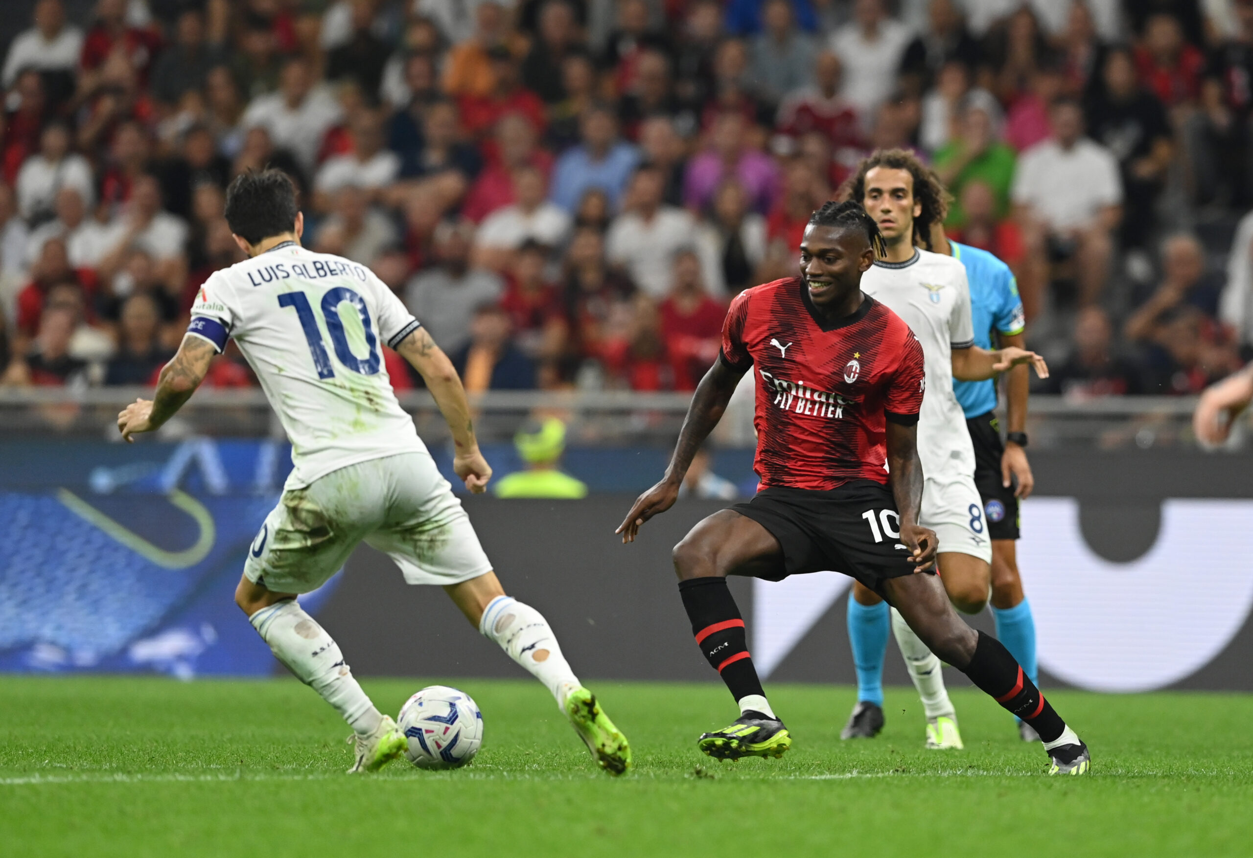 MILAN, ITALY - SEPTEMBER 30: Rafael Leao of AC Milan battles for the ball with Luis Alberto of SS Lazio during the Serie A TIM match between AC Milan and SS Lazio at Stadio Giuseppe Meazza on September 30, 2023 in Milan, Italy. (Photo by Claudio Villa/AC Milan via Getty Images)