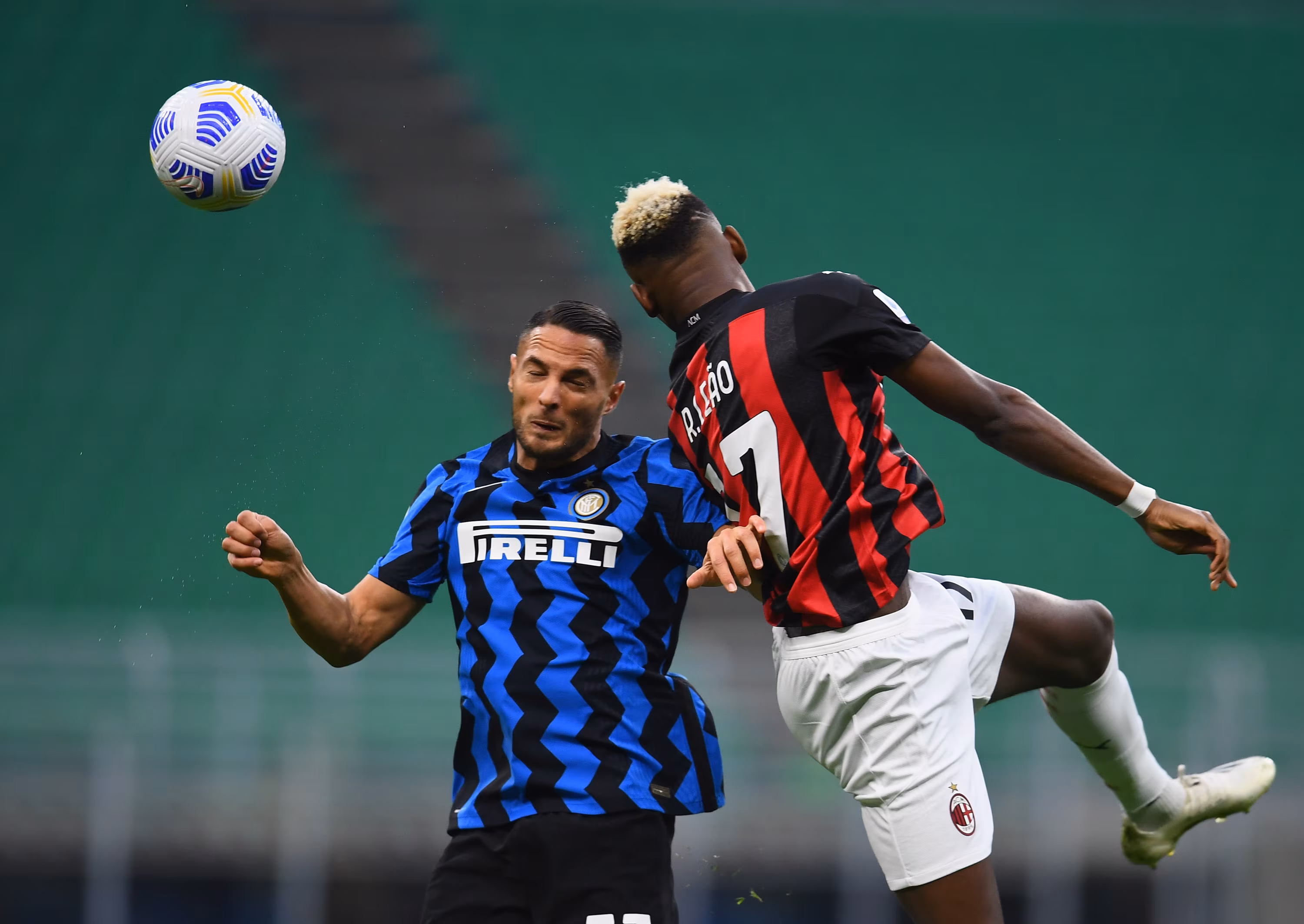 MILAN, ITALY - OCTOBER 17: Danilo D'Ambrosio of FC Internazionale competes for the ball with Rafael Leao of AC Milan during the Serie A match between FC Internazionale and AC Milan at Stadio Giuseppe Meazza on October 17, 2020 in Milan, Italy. (Photo by Claudio Villa - Inter/Inter via Getty Images)