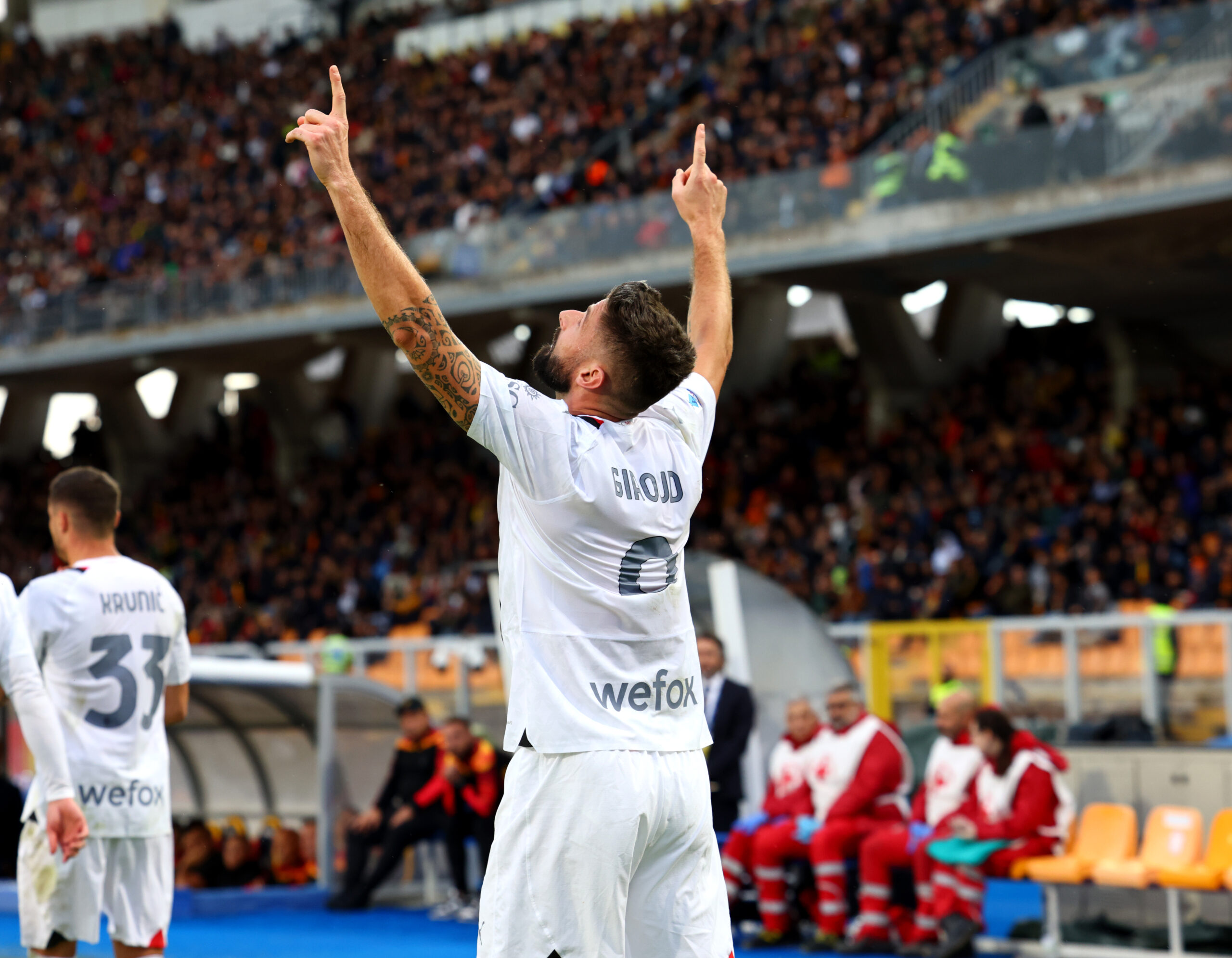 LECCE, ITALY - NOVEMBER 11: Olivier Giroud of Milan celebrates after scoring his team's first goal during the Serie A TIM match between US Lecce and AC Milan at Stadio Via del Mare on November 11, 2023 in Lecce, Italy. (Photo by Maurizio Lagana/Getty Images)
