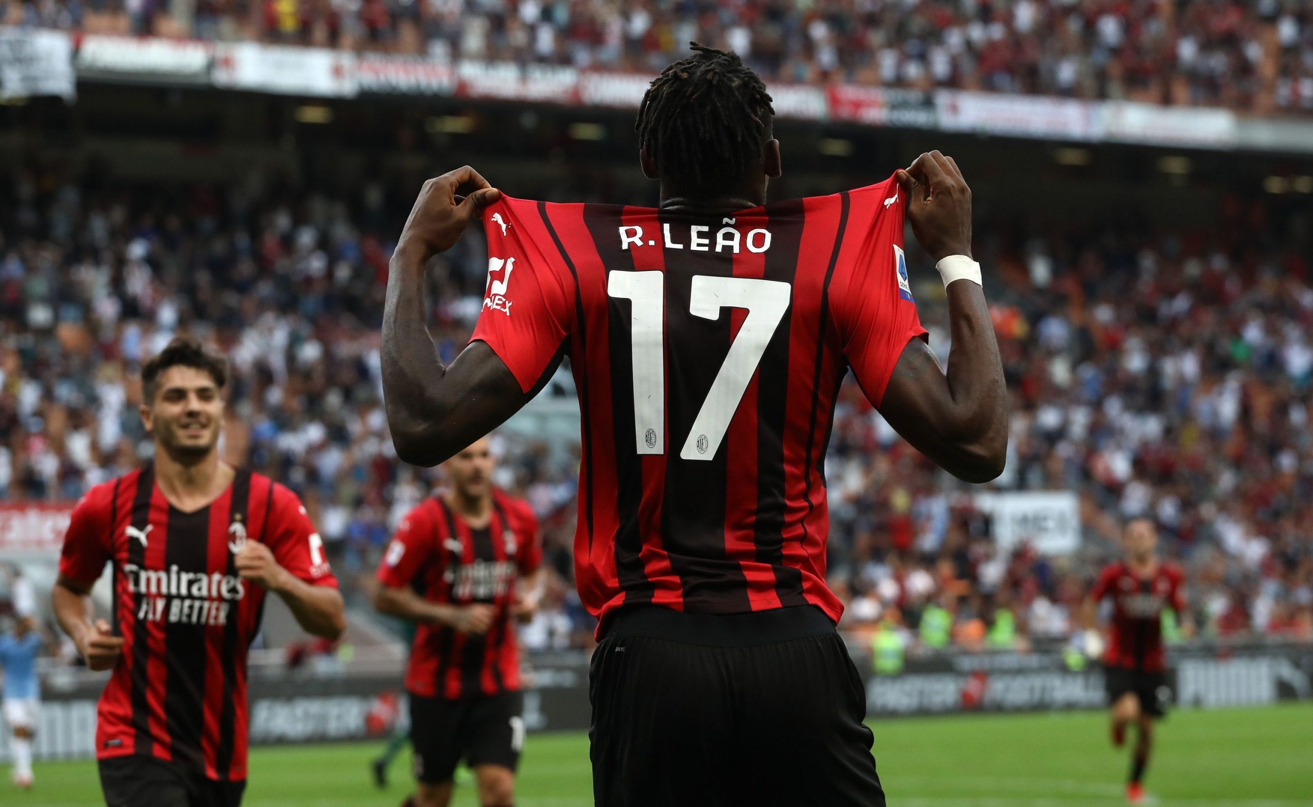 MILAN, ITALY - SEPTEMBER 12: Rafael Leao of AC Milan celebrates after scoring the opening goal during the Serie A match between AC Milan and SS Lazio at Stadio Giuseppe Meazza on September 12, 2021 in Milan, Italy. (Photo by Marco Luzzani/Getty Images)