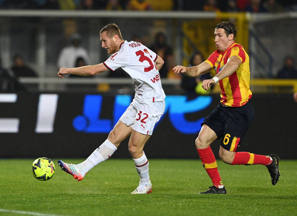 LECCE, ITALY - JANUARY 14: Tommaso Pobega of AC Milan competes for the ball with Federico Baschirotto of US Lecce during the Serie A match between US Lecce and AC MIlan at Stadio Via del Mare on January 14, 2023 in Lecce, Italy. (Photo by Claudio Villa/AC Milan via Getty Images)