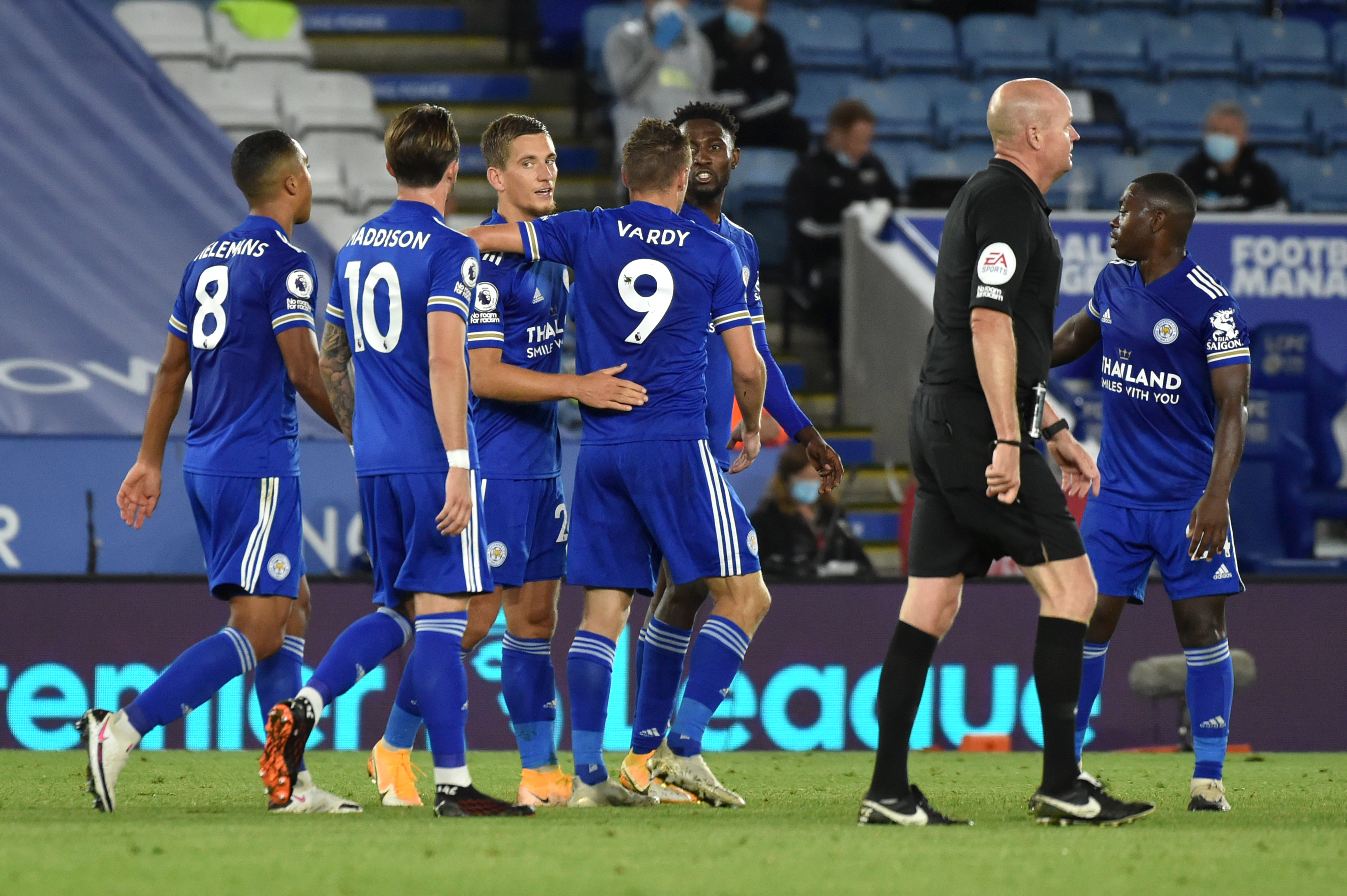 LEICESTER, ENGLAND - SEPTEMBER 20: Dennis Praet of Leicester City celebrates with teammates after scoring his team's fourth goal during the Premier League match between Leicester City and Burnley at The King Power Stadium on September 20, 2020 in Leicester, England. (Photo by Rui Vieira - Pool/Getty Images)