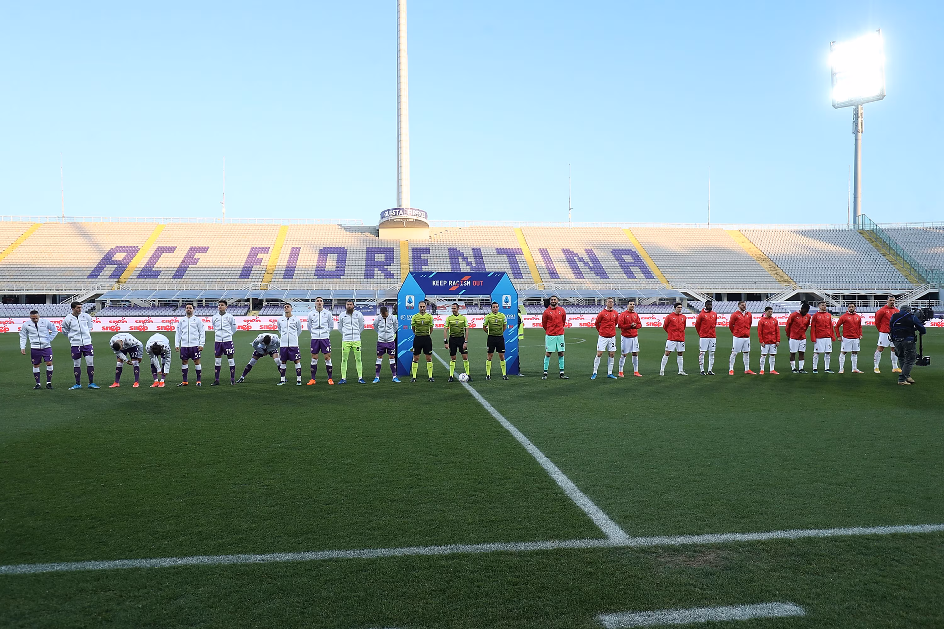 Fiorentina e Milan schierate al centro dello stadio "Artemio Franchi" di Firenze