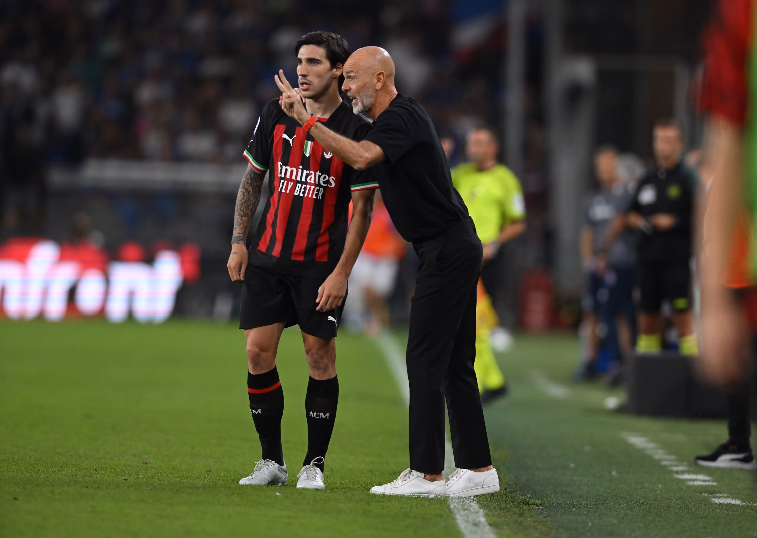 GENOA, ITALY - SEPTEMBER 10: Head coach of AC Milan Stefano Pioli speaks with Sandro Tonal during the Serie A match between UC Sampdoria and AC MIlan at Stadio Luigi Ferraris on September 10, 2022 in Genoa, Italy. (Photo by Claudio Villa/AC Milan via Getty Images)