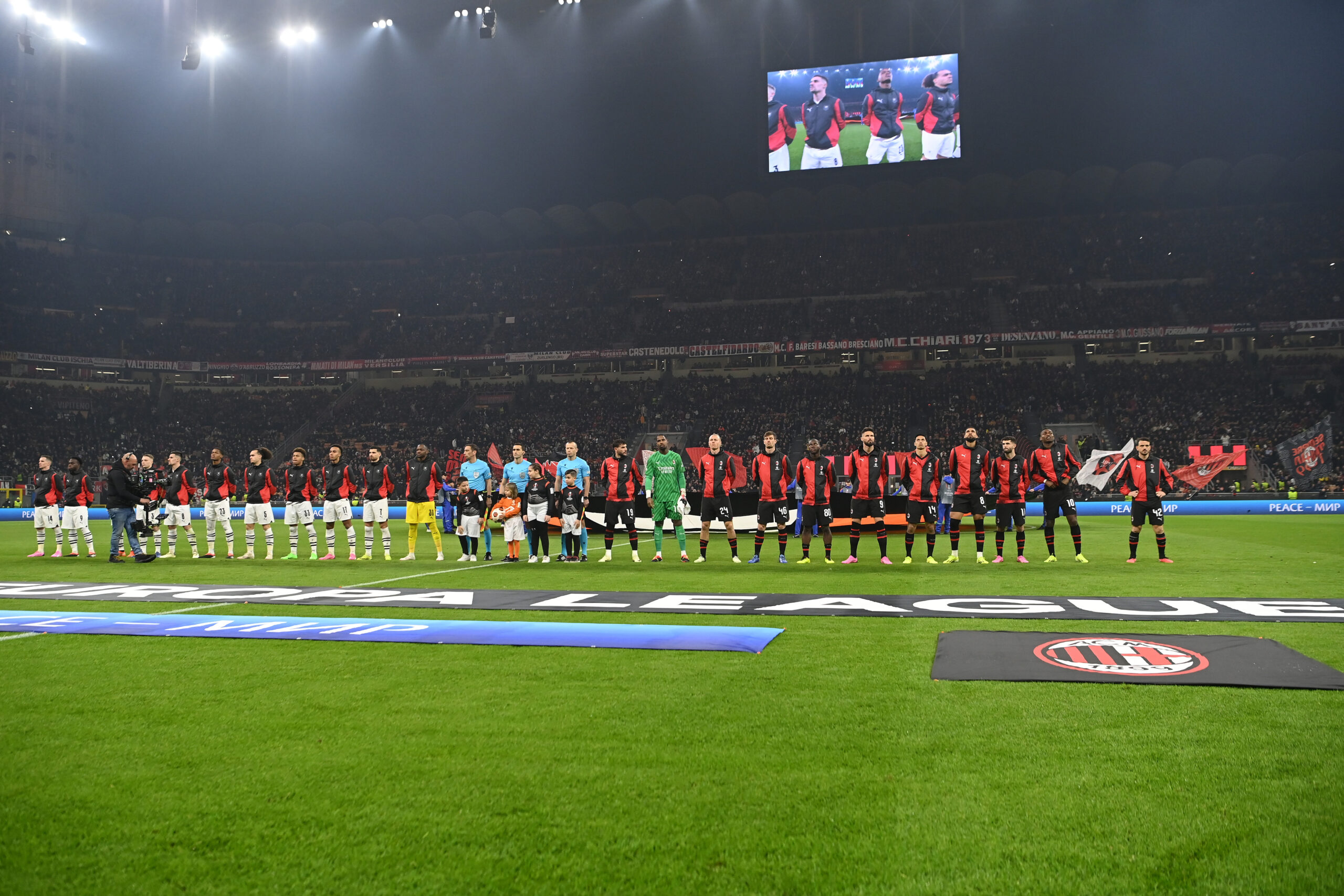 MILAN, ITALY - FEBRUARY 15: Players of AC Milan line up prior to the UEFA Europa League 2023/24 Playoff first leg match between AC Milan and Stade Rennais FC at Stadio Giuseppe Meazza on February 15, 2024 in Milan, Italy. (Photo by Claudio Villa/AC Milan via Getty Images)
