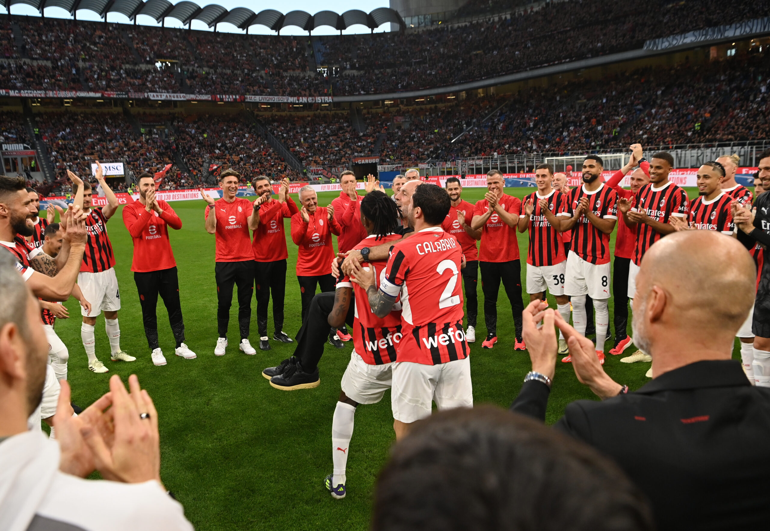 MILAN, ITALY - MAY 25: Head coach of AC Milan Stefano Pioli greets the players for his last match with AC Milan at the end of the Serie A TIM match between AC Milan and US Salernitana at Stadio Giuseppe Meazza on May 25, 2024 in Milan, Italy. (Photo by Claudio Villa/AC Milan via Getty Images)