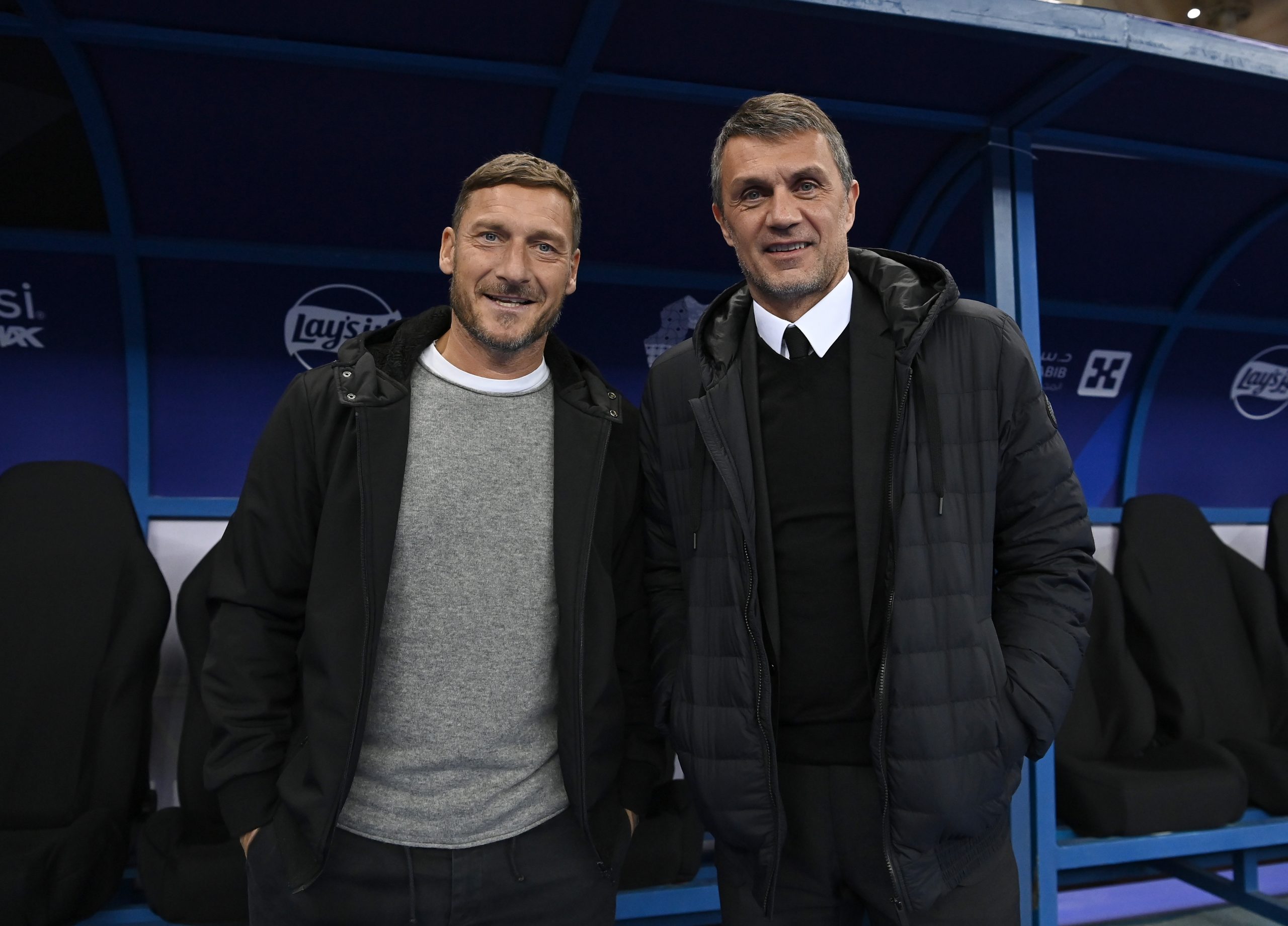 RIYADH, SAUDI ARABIA - JANUARY 18: Paolo Maldini of AC Milan and Francesco Totti attend before the EA Sports Supercup match between AC Milan and FC Internazionale at King Fahd International Stadium on January 18, 2023 in Riyadh, Saudi Arabia. (Photo by Claudio Villa/AC Milan via Getty Images)