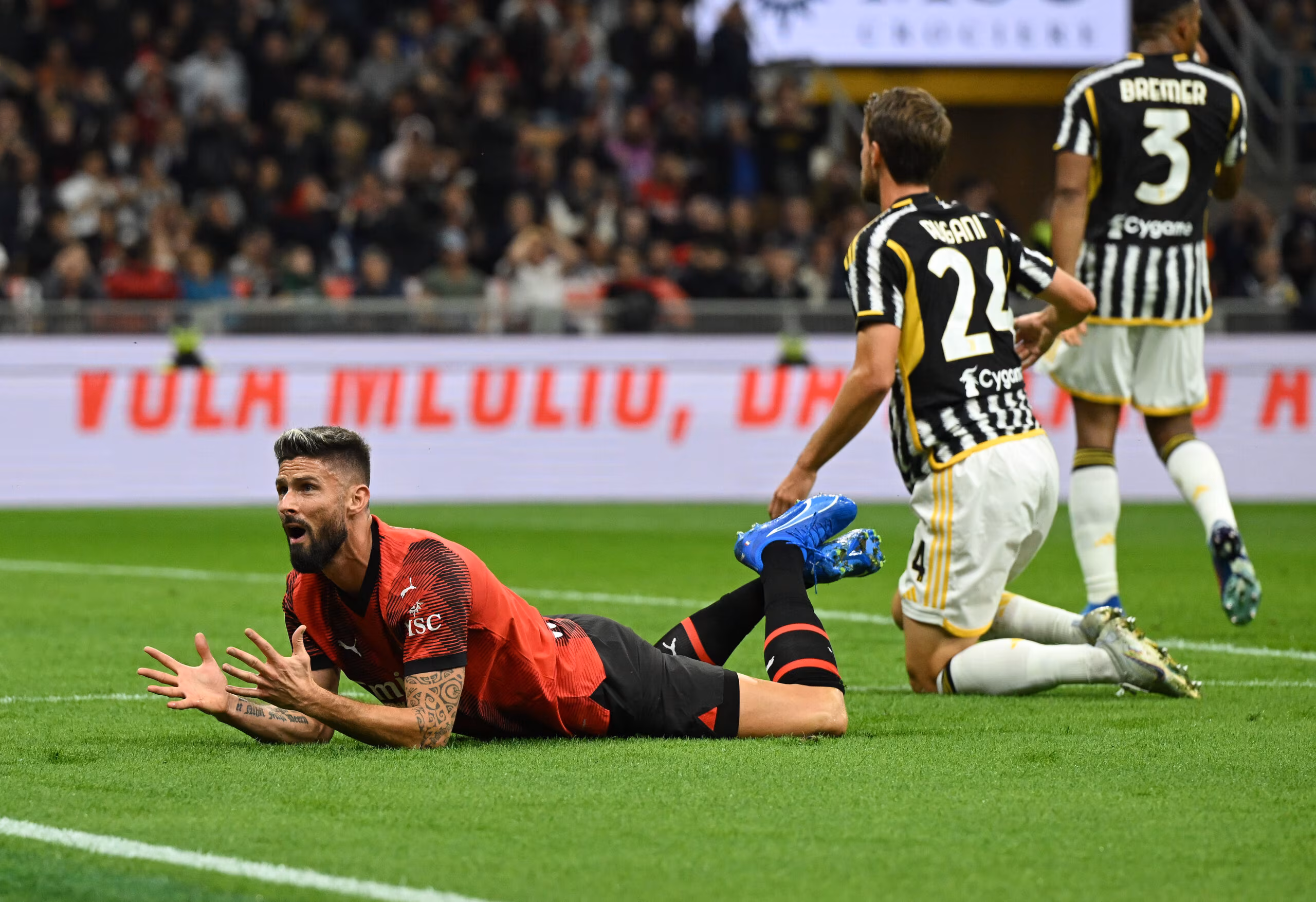 MILAN, ITALY - OCTOBER 22: Olivier Giroud of AC Milan reacts during the Serie A TIM match between AC Milan and Juventus at Stadio Giuseppe Meazza on October 22, 2023 in Milan, Italy. (Photo by Claudio Villa/AC Milan via Getty Images)