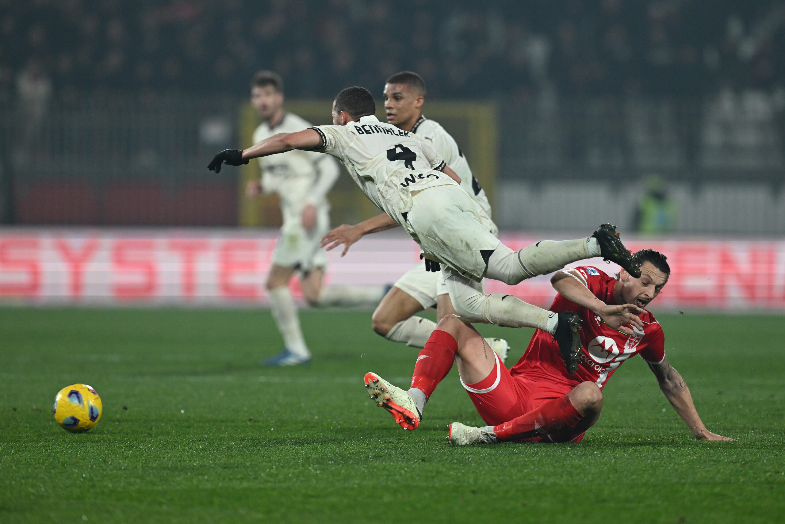 MONZA, ITALY - FEBRUARY 18: Ismael Bennacer of AC Milan competes for the ball with Milan Djuric of AC Monza during the Serie A TIM match between AC Monza and AC Milan - Serie A TIM at U-Power Stadium on February 18, 2024 in Monza, Italy. (Photo by Claudio Villa/AC Milan via Getty Images)