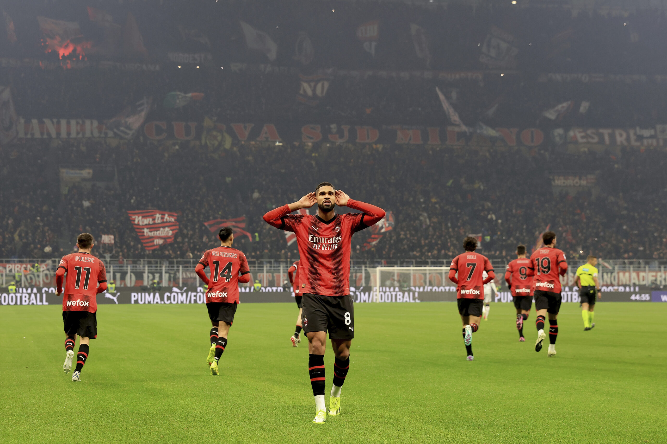 MILAN, ITALY - JANUARY 27: Ruben Loftus-Cheek of AC Milan celebrates after scoring the his team's first goal during the Serie A TIM match between AC Milan and Bologna FC - Serie A TIM at Stadio Giuseppe Meazza on January 27, 2024 in Milan, Italy. (Photo by Giuseppe Cottini/AC Milan via Getty Images)