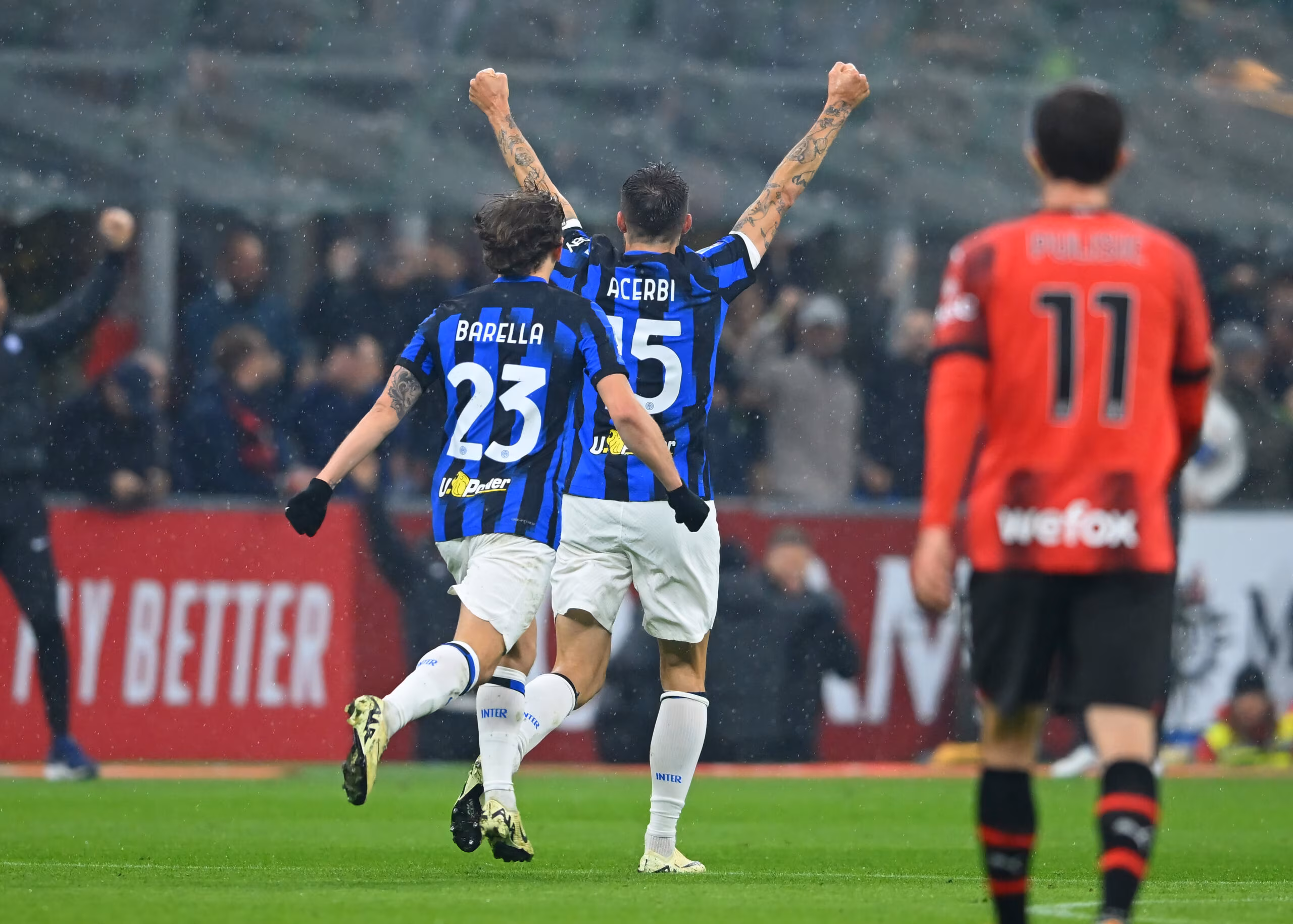 MILAN, ITALY - APRIL 22: Francesco Acerbi of FC Internazionale celebrates after scoring his team's first goal with teammate Nicolo Barella during the Serie A TIM match between AC Milan and FC Internazionale at Stadio Giuseppe Meazza on April 22, 2024 in Milan, Italy. (Photo by Mattia Pistoia - Inter/Inter via Getty Images)