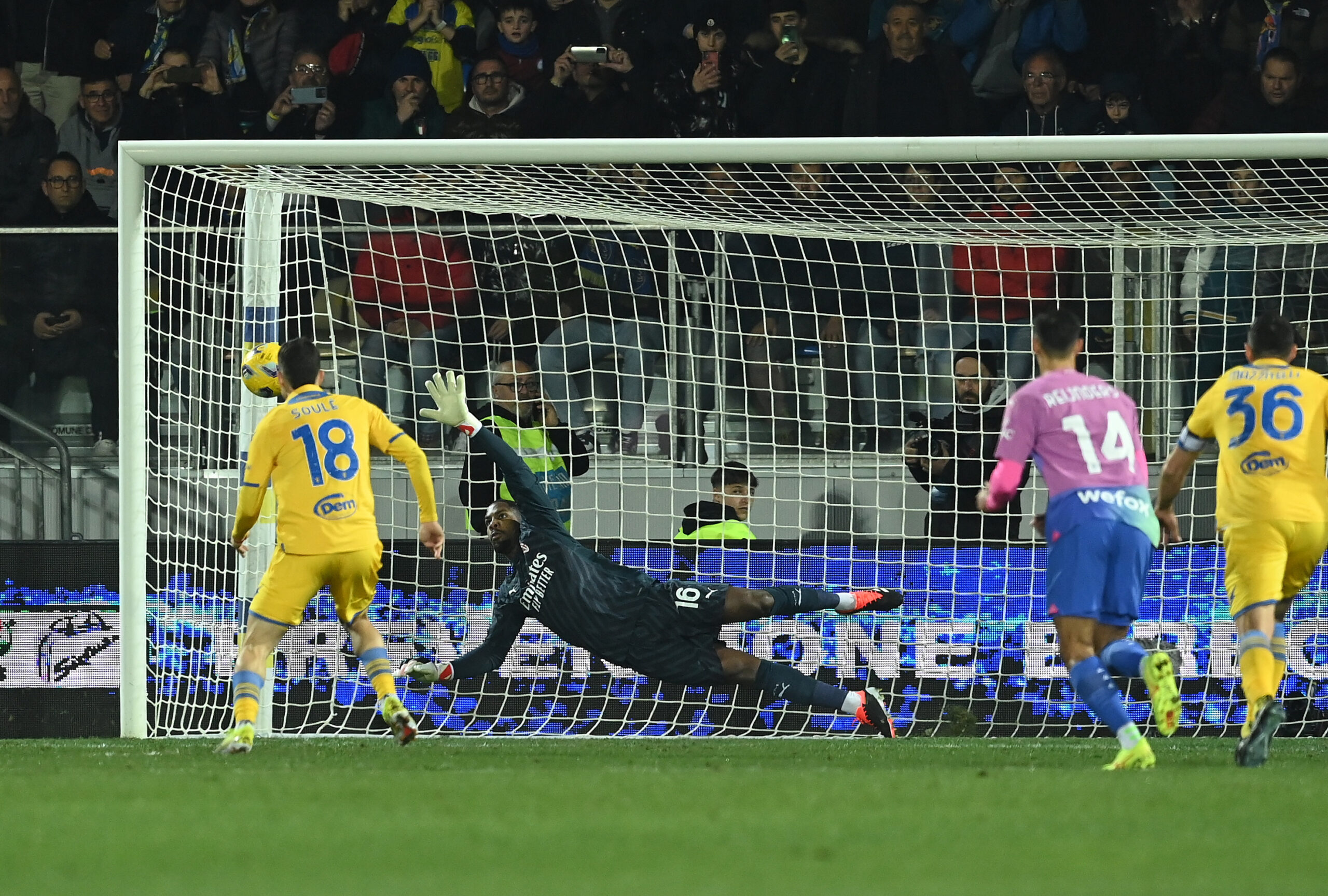 FROSINONE, ITALY - FEBRUARY 03: Mike Maignan of AC Milan in action during the Serie A TIM match between Frosinone Calcio and AC Milan at Stadio Benito Stirpe on February 03, 2024 in Frosinone, Italy. (Photo by Claudio Villa/AC Milan via Getty Images)