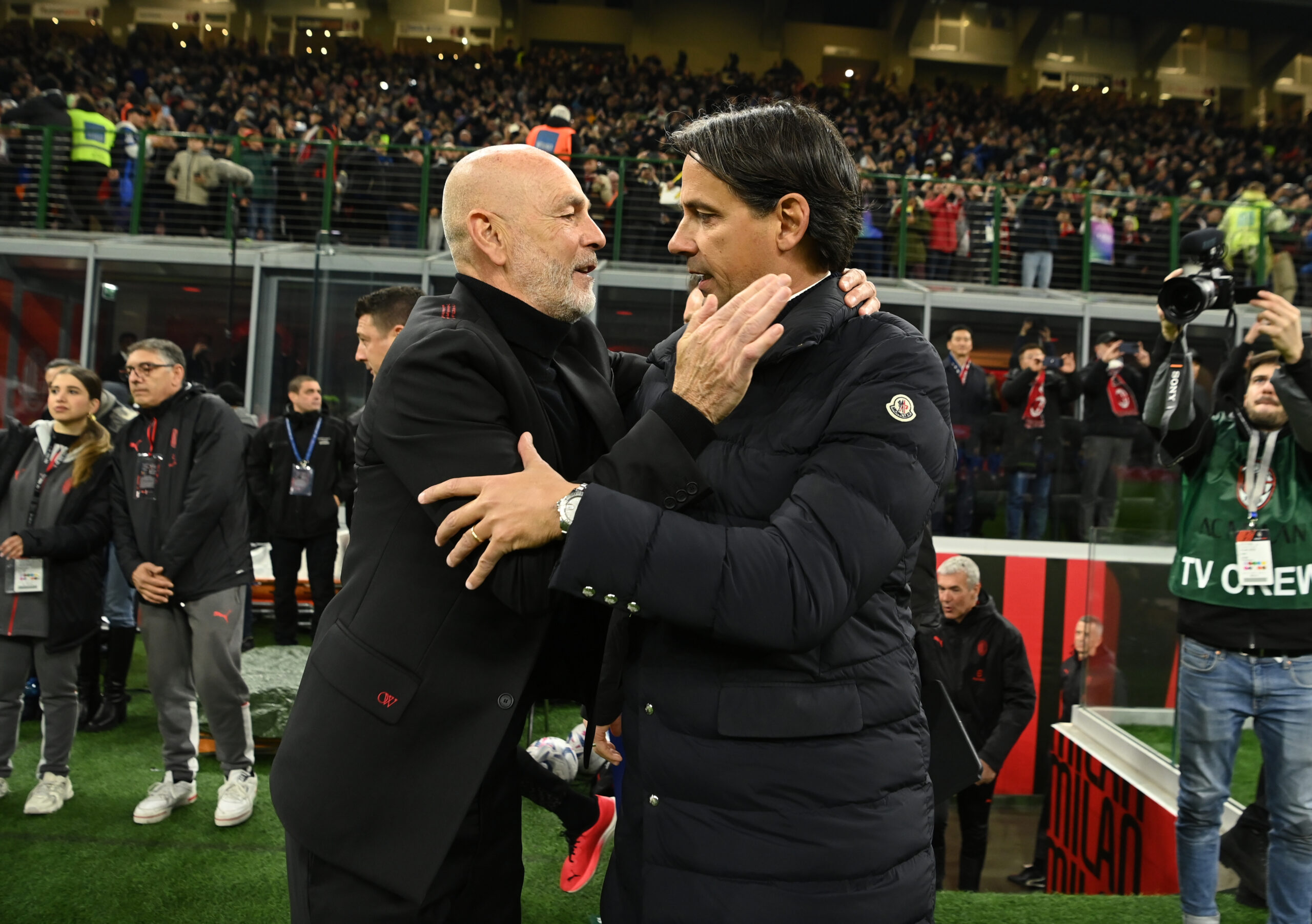 MILAN, ITALY - APRIL 22: Head coach of AC Milan Stefano Pioli shakes hands with head coach of FC Internazionale Simone Inzaghi before the Serie A TIM match between AC Milan and FC Internazionale at Stadio Giuseppe Meazza on April 22, 2024 in Milan, Italy. (Photo by Claudio Villa/AC Milan via Getty Images) (Photo by Claudio Villa/AC Milan via Getty Images)