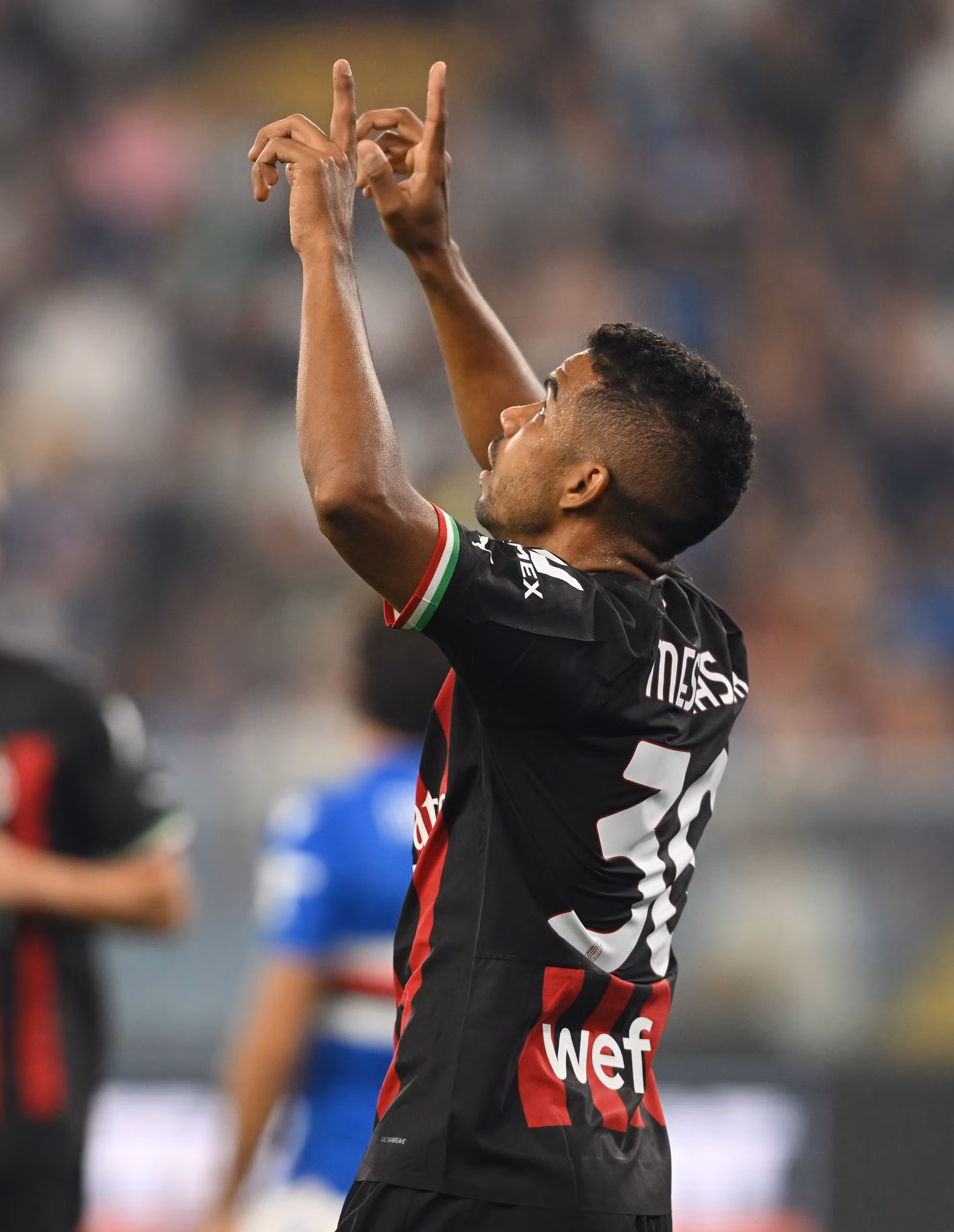 GENOA, ITALY - SEPTEMBER 10: Junior Messias of AC Milan celebrates after scoring the opening goal during the Serie A match between UC Sampdoria and AC MIlan at Stadio Luigi Ferraris on September 10, 2022 in Genoa, Italy. (Photo by Claudio Villa/AC Milan via Getty Images)
