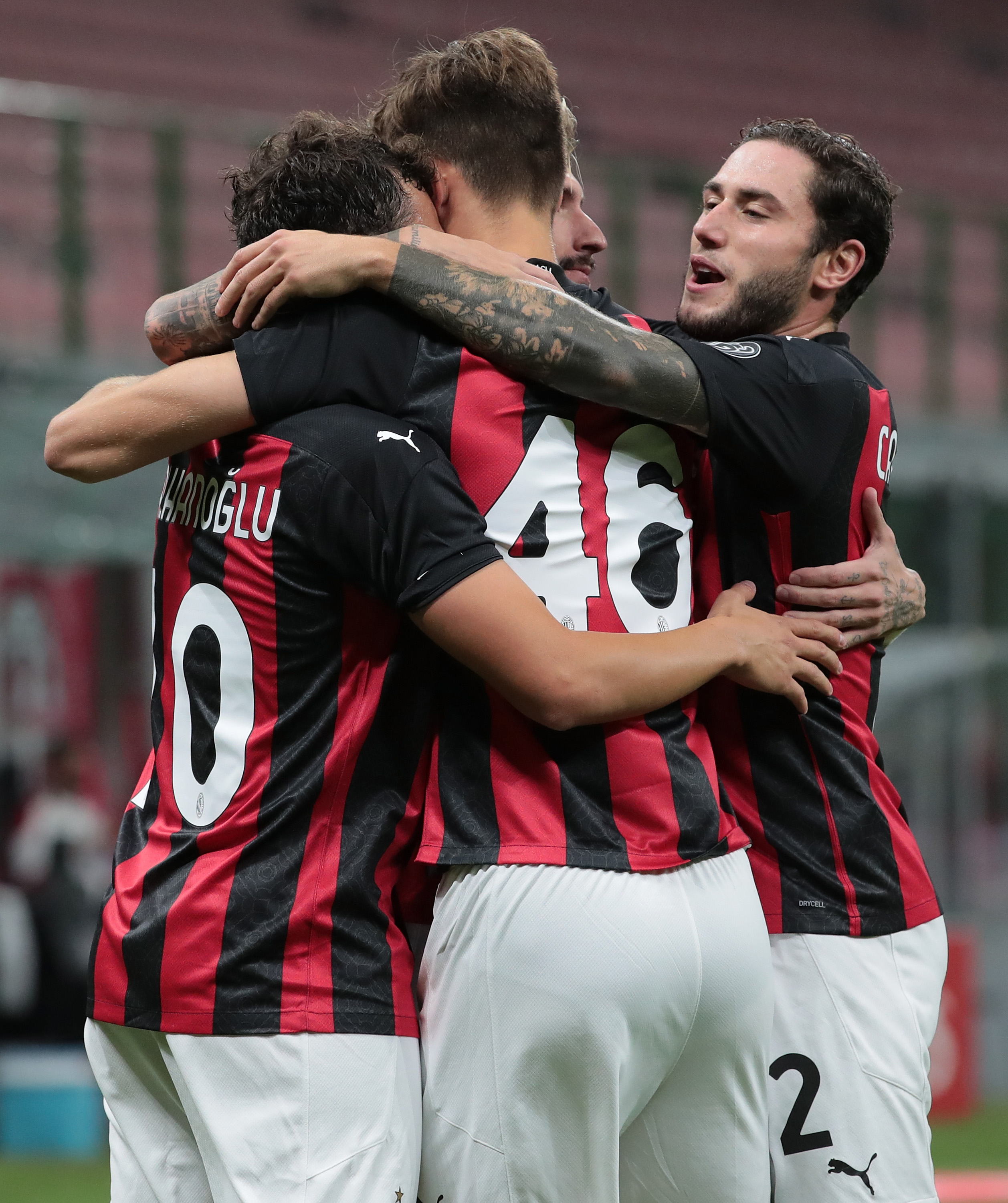 MILAN, ITALY - SEPTEMBER 24: Hakan Calhanoglu of AC Milan celebrates his second goal with his team-mates during the UEFA Europa League third qualifying round match between AC Milan and Bodo Glimt at Stadio Giuseppe Meazza on September 24, 2020 in Milan, Italy. (Photo by Emilio Andreoli/Getty Images)