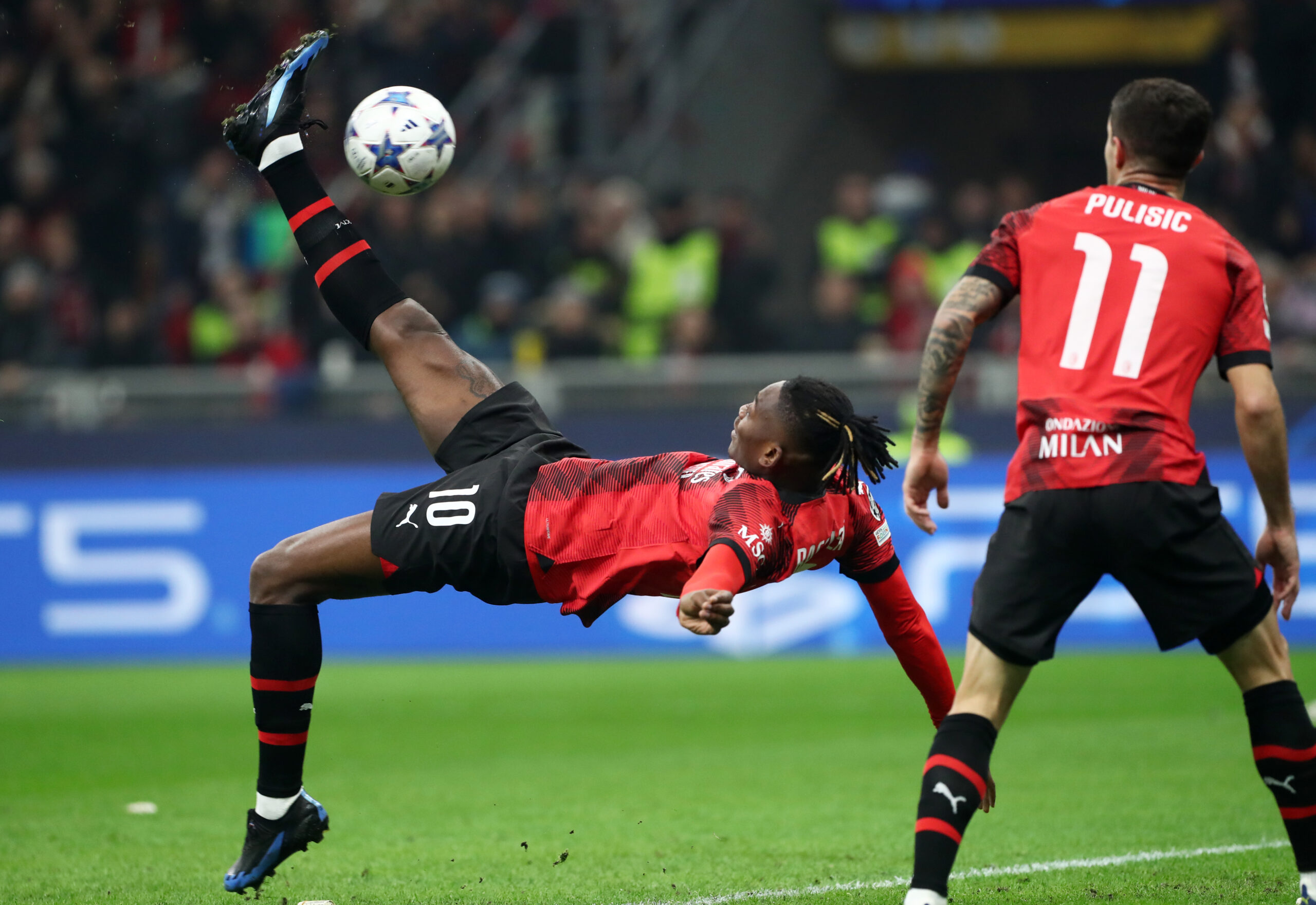 MILAN, ITALY - NOVEMBER 07: Rafael Leao of AC Milan scores the team's first goal during the UEFA Champions League match between AC Milan and Paris Saint-Germain at Stadio Giuseppe Meazza on November 07, 2023 in Milan, Italy. (Photo by Marco Luzzani/Getty Images)
