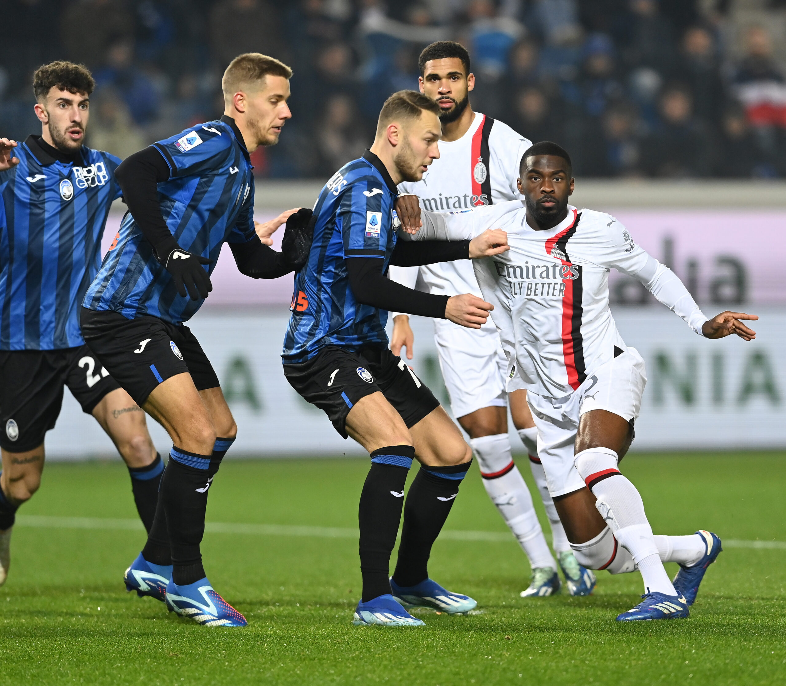 BERGAMO, ITALY - DECEMBER 09: Fikayo Tomor of AC Milan in action during the Serie A TIM match between Atalanta BC and AC Milan at Gewiss Stadium on December 09, 2023 in Bergamo, Italy. (Photo by Claudio Villa/AC Milan via Getty Images)