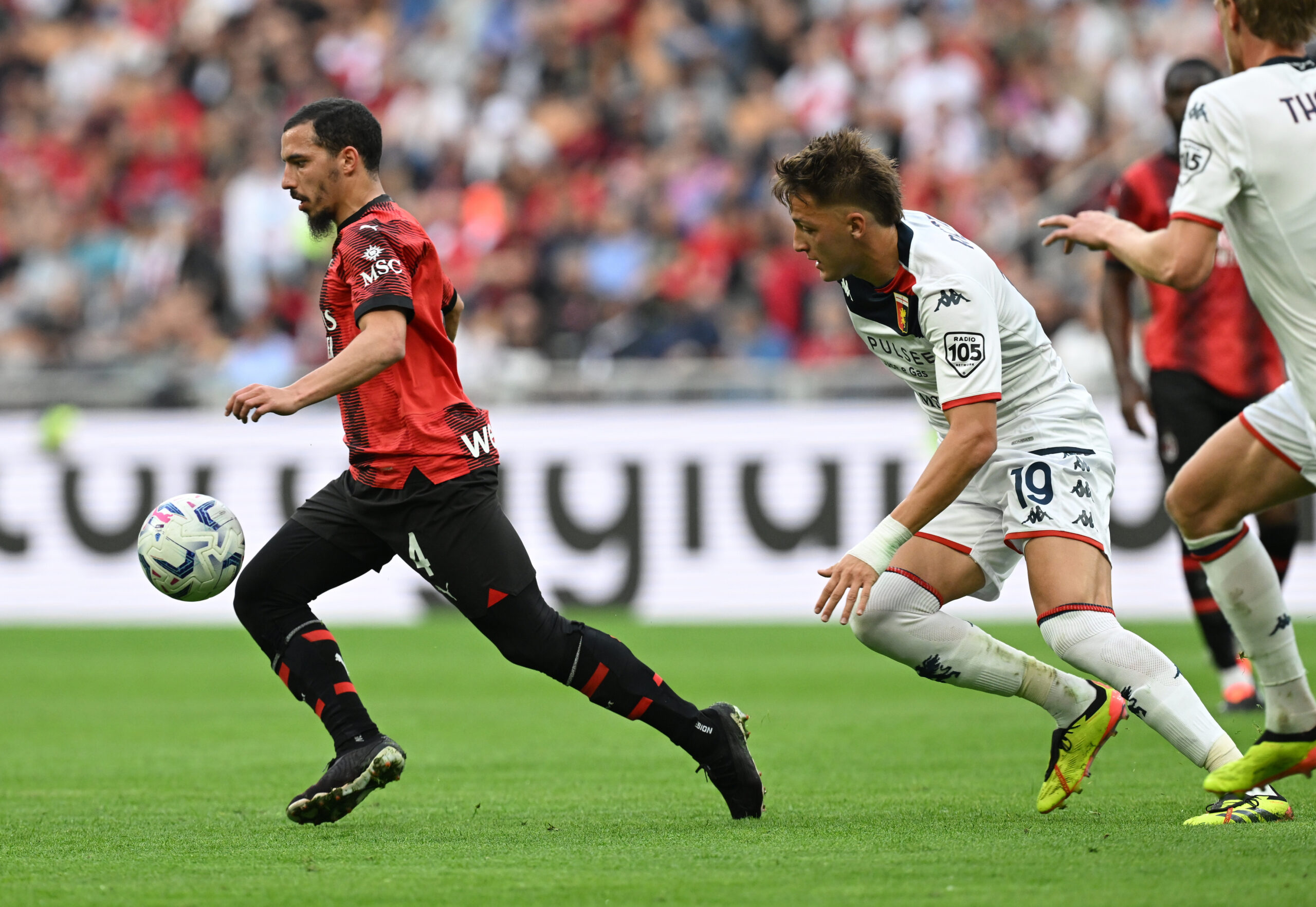 MILAN, ITALY - MAY 05: Ismael Bennacer of AC Milan competes for the ball with Mateo Retegui of Genoa CFC during the Serie A TIM match between AC Milan and Genoa CFC at Stadio Giuseppe Meazza on May 05, 2024 in Milan, Italy. (Photo by Claudio Villa/AC Milan via Getty Images)