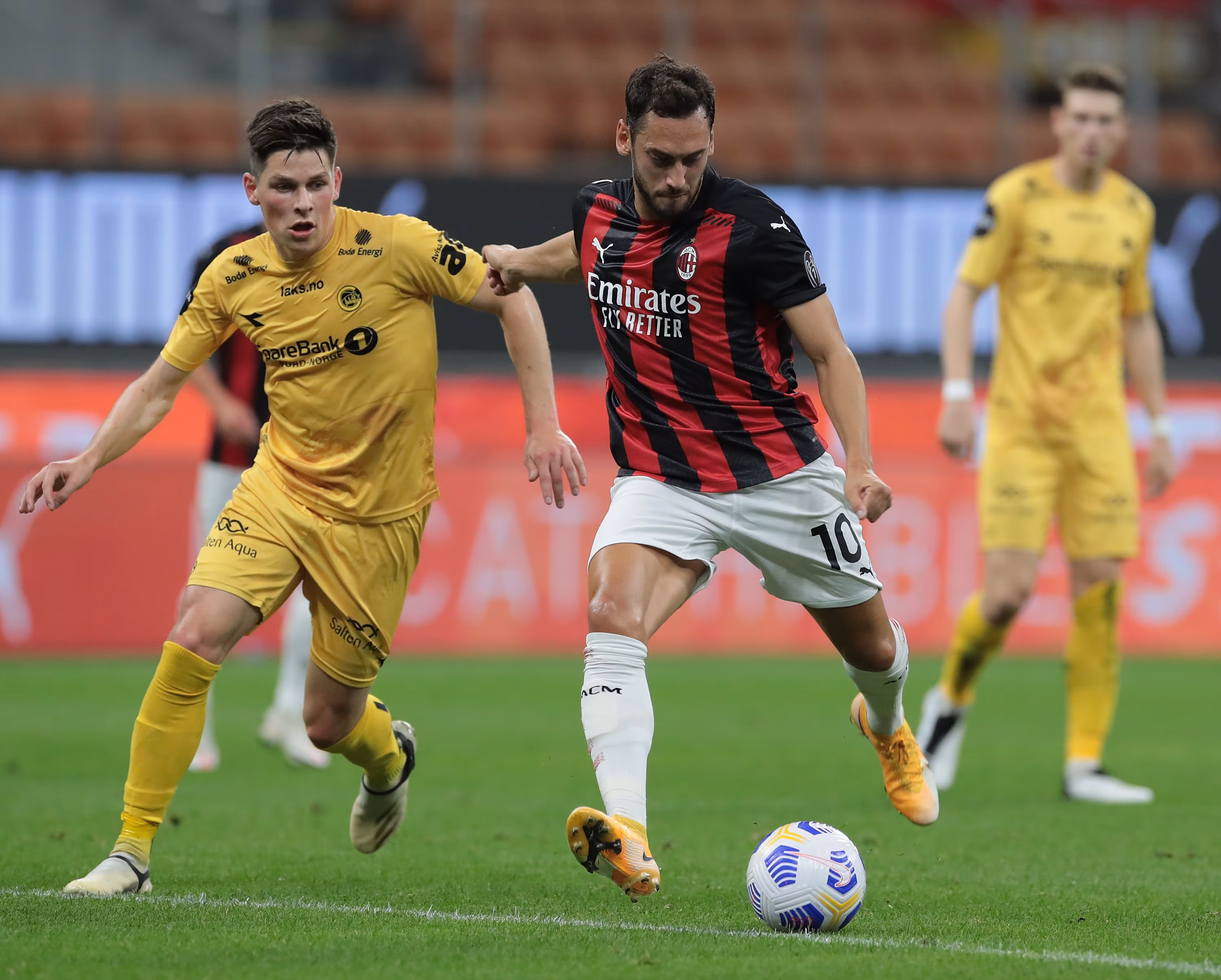 PRIMO TEMPO – Partono bene i norvegesi che provano, seppur con evidenti differenze tecniche a fare gioco e a portarsi volentieri nella metà campo avversaria. E’ proprio dei gialli infatti la prima conclusione in porta che non impegna comunque particolarmente Gigio Donnarumma. All’undicesimo minuto ci prova Calabria con una conclusione potente, ma imprecisa. Al 14esimo passa in vantaggio il Bodø con un contropiede rapidissmo, traversone basso dalla sinistra e Kaspet Junker batte Donnarumma. Due minuti dopo arriva subito la risposta rossonera: controllo, dribbling e conclusione di sinistro di Calhanoglu, tutto perfetto ed il Milan la pareggia. Al 22esimo ci riprova ancora Calhanoglu, tiro dai 25 metri di poco alto. Al 26esimo minuto Lorenzo Colombo impensierisce con una sassata dall’interno dell’area di rigore l’estremo difensore norvegese che però risponde prontamente. Al 32esimo arriva il primo gol di Colombo in gara ufficiale: azione da play condotta sulla sinistra, gran giocata di Calhanoglu di tacco a smarcare l’attaccante rossonera che insacca da pochi metri.