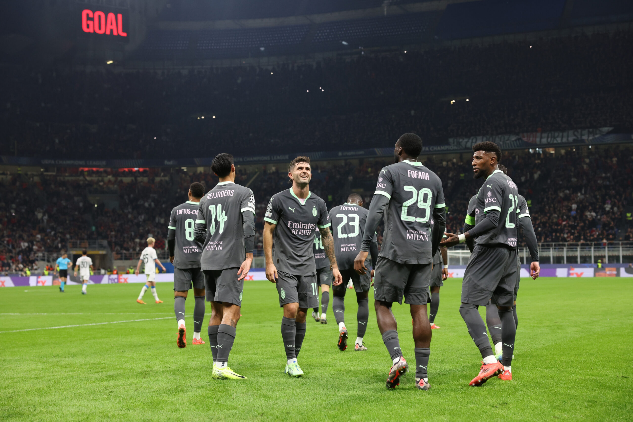 MILAN, ITALY - OCTOBER 22: Christian Pulisic of AC Milan celebrates with team-mates after scoring the goal during the UEFA Champions League 2024/25 League Phase MD3 match between AC Milan and Club Brugge KV at Stadio San Siro on October 22, 2024 in Milan, Italy. (Photo by Claudio Villa/AC Milan via Getty Images)