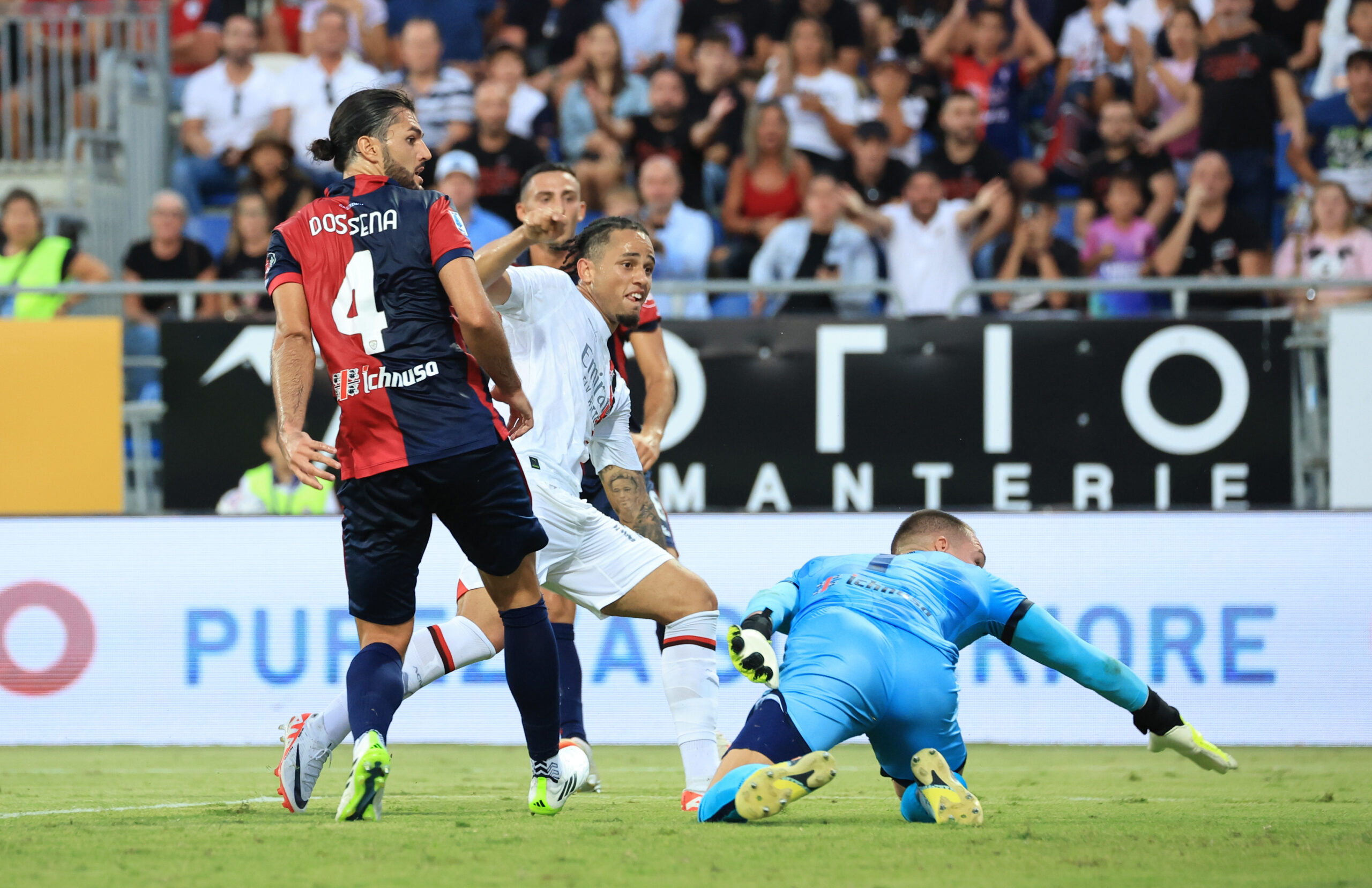 CAGLIARI, ITALY - SEPTEMBER 27: Noah Okafor of Milan scores his tema's first goal during the Serie A TIM match between Cagliari Calcio and AC Milan at Sardegna Arena on September 27, 2023 in Cagliari, Italy. (Photo by Giuseppe Cottini/AC Milan via Getty Images)