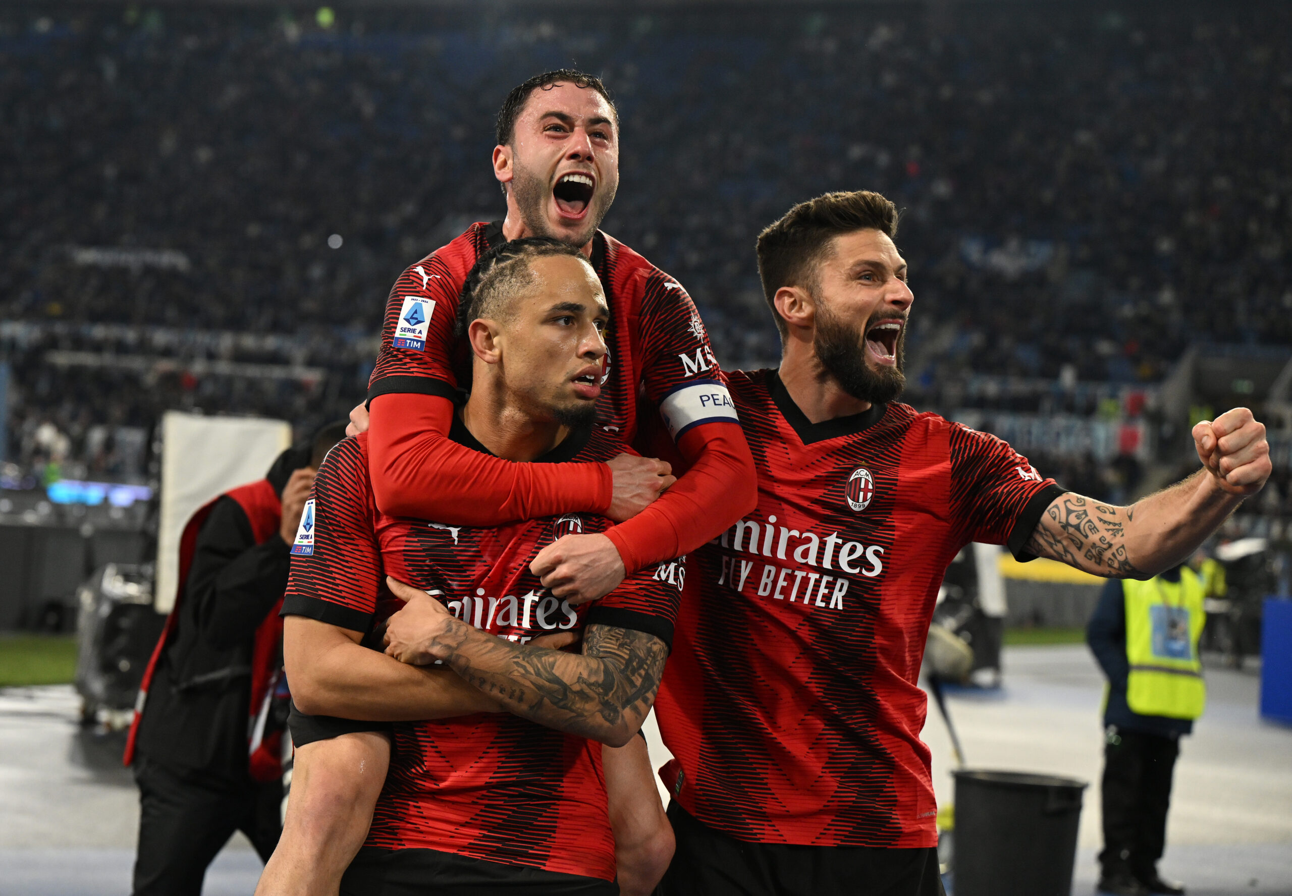ROME, ITALY - MARCH 01: Noah Okafor of AC Milan celebrates with teammates Olivier Giroud and Davide Calabria after scoring the goal during the Serie A TIM match between SS Lazio and AC Milan - Serie A TIM at Stadio Olimpico on March 01, 2024 in Rome, Italy. (Photo by Claudio Villa/AC Milan via Getty Images)