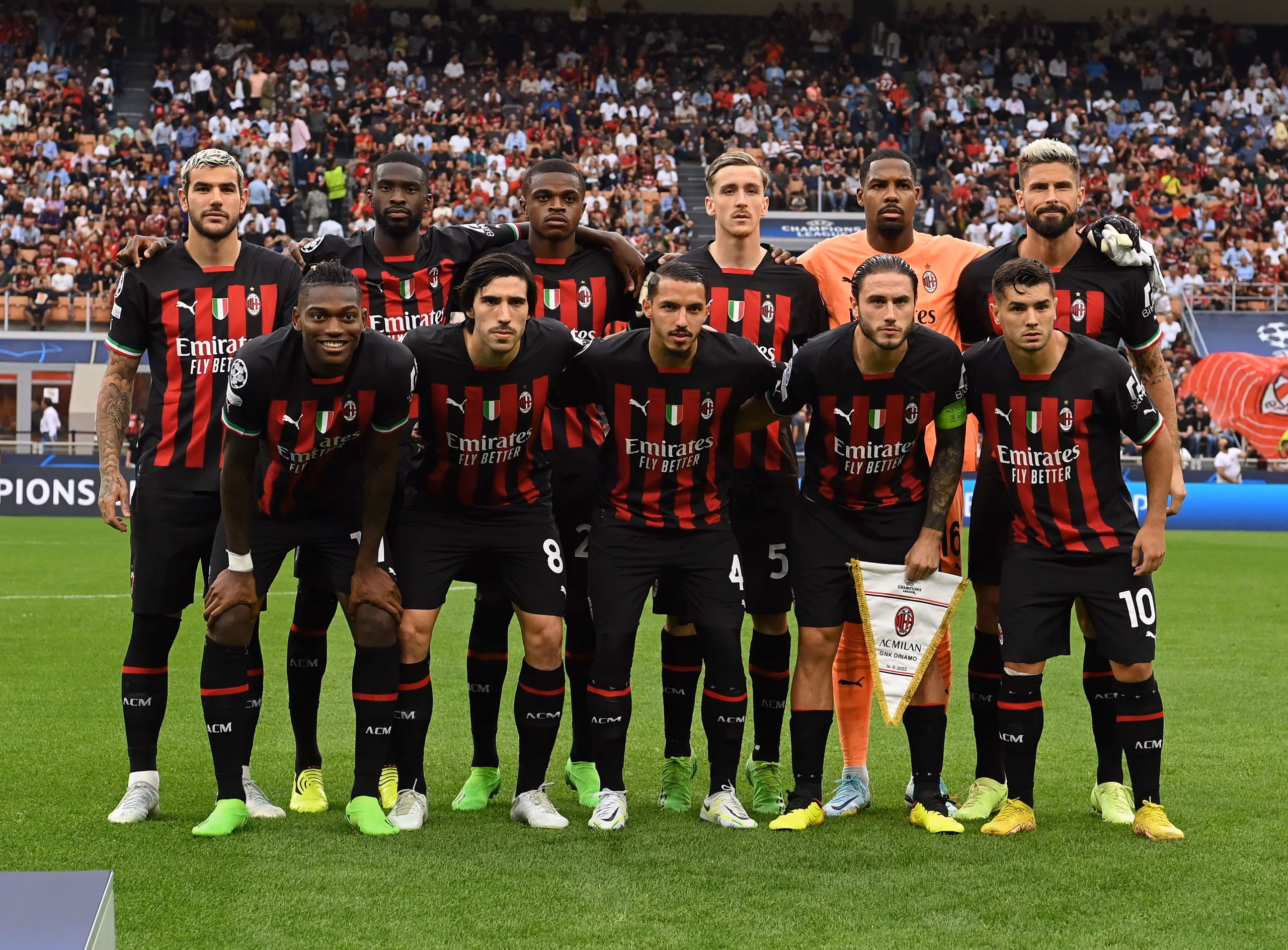 MILAN, ITALY - SEPTEMBER 14: Players of AC Milan line up prior to the UEFA Champions League group E match between AC Milan and Dinamo Zagreb at Giuseppe Meazza Stadium on September 14, 2022 in Milan, Italy. (Photo by Claudio Villa/AC Milan via Getty Images)