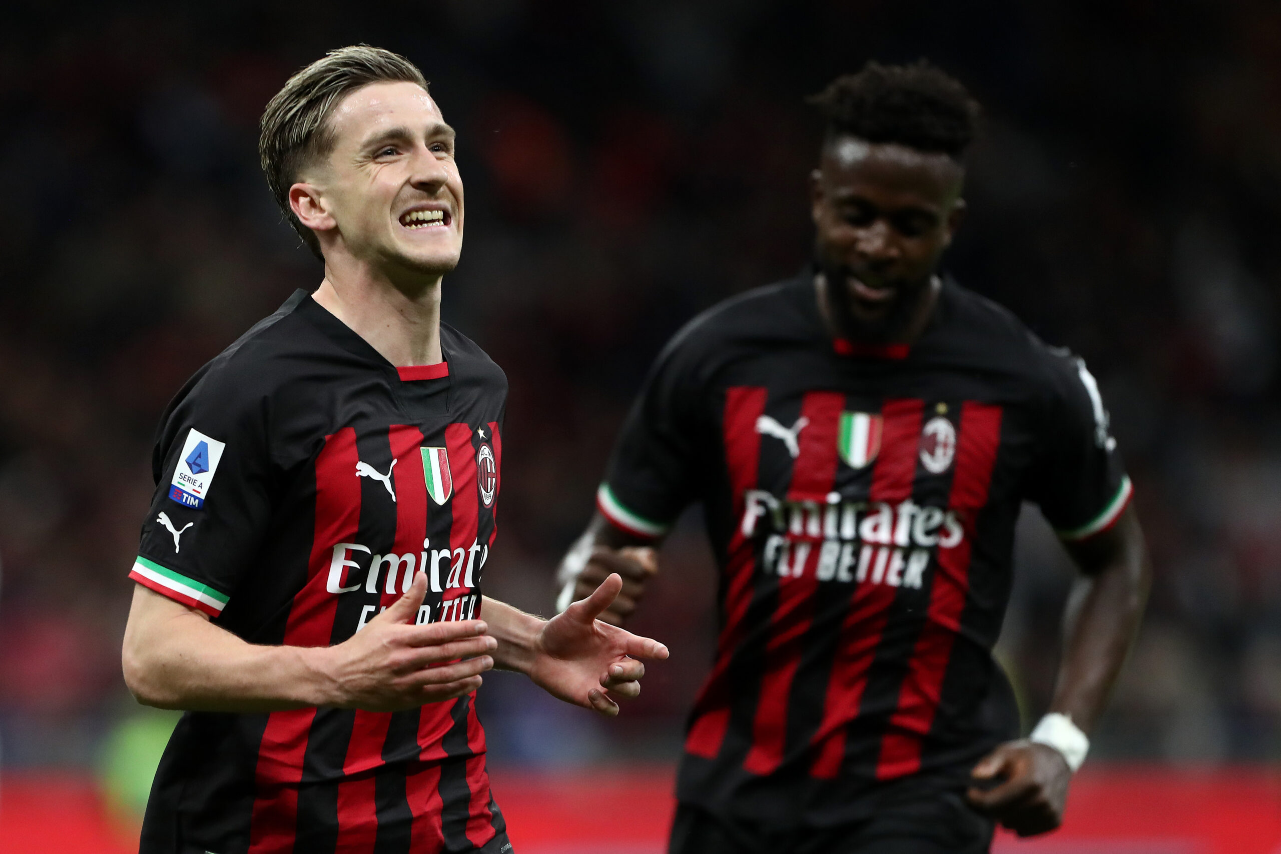 MILAN, ITALY - MAY 03: Alexis Saelemaekers of AC Milan celebrates a goal which was disallowed by VAR during the Serie A match between AC Milan and US Cremonese at Stadio Giuseppe Meazza on May 03, 2023 in Milan, Italy. (Photo by Marco Luzzani/Getty Images)