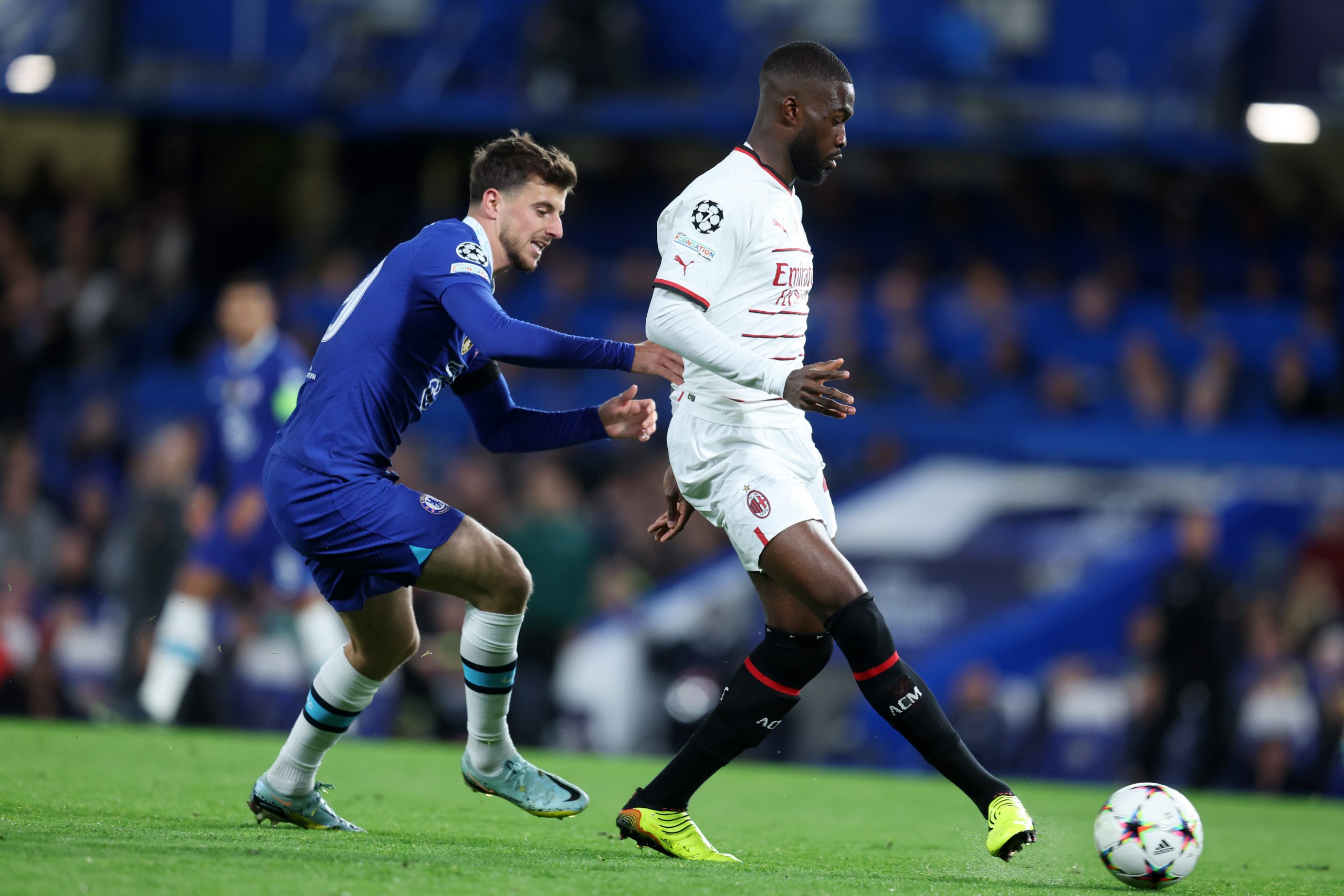 LONDON, ENGLAND - OCTOBER 05: Fikayo Tomori of AC Milan is challenged by Mason Mount of Chelsea during the UEFA Champions League group E match between Chelsea FC and AC Milan at Stamford Bridge on October 05, 2022 in London, England. (Photo by Catherine Ivill/Getty Images)