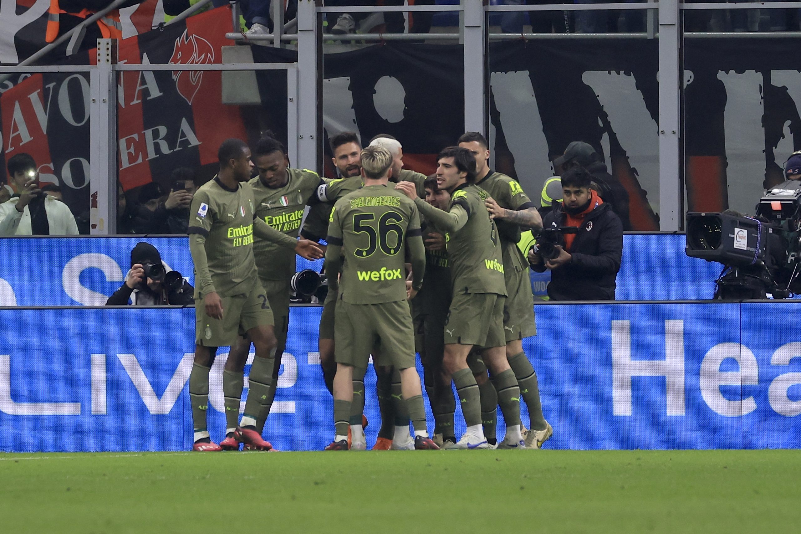 MILAN, ITALY - FEBRUARY 10: Olivier Giroud of AC Milan celebrates after scoring the opening goal during the Serie A match between AC MIlan and Torino FC at Stadio Giuseppe Meazza on February 10, 2023 in Milan, Italy. (Photo by Giuseppe Cottini/AC Milan via Getty Images)