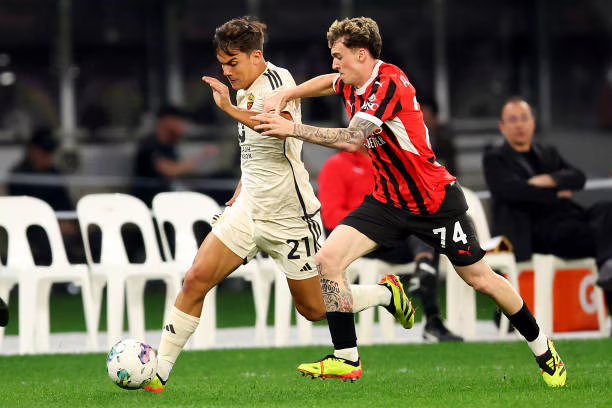 PERTH, AUSTRALIA - MAY 31: Paulo Dybala of AS Roma and Alejandro Jimenez Sanchez of AC Milan tussle for the ball during the friendly between AC Milan and AS Roma at Optus Stadium on May 31, 2024 in Perth, Australia. (Photo by James Worsfold/Getty Images)