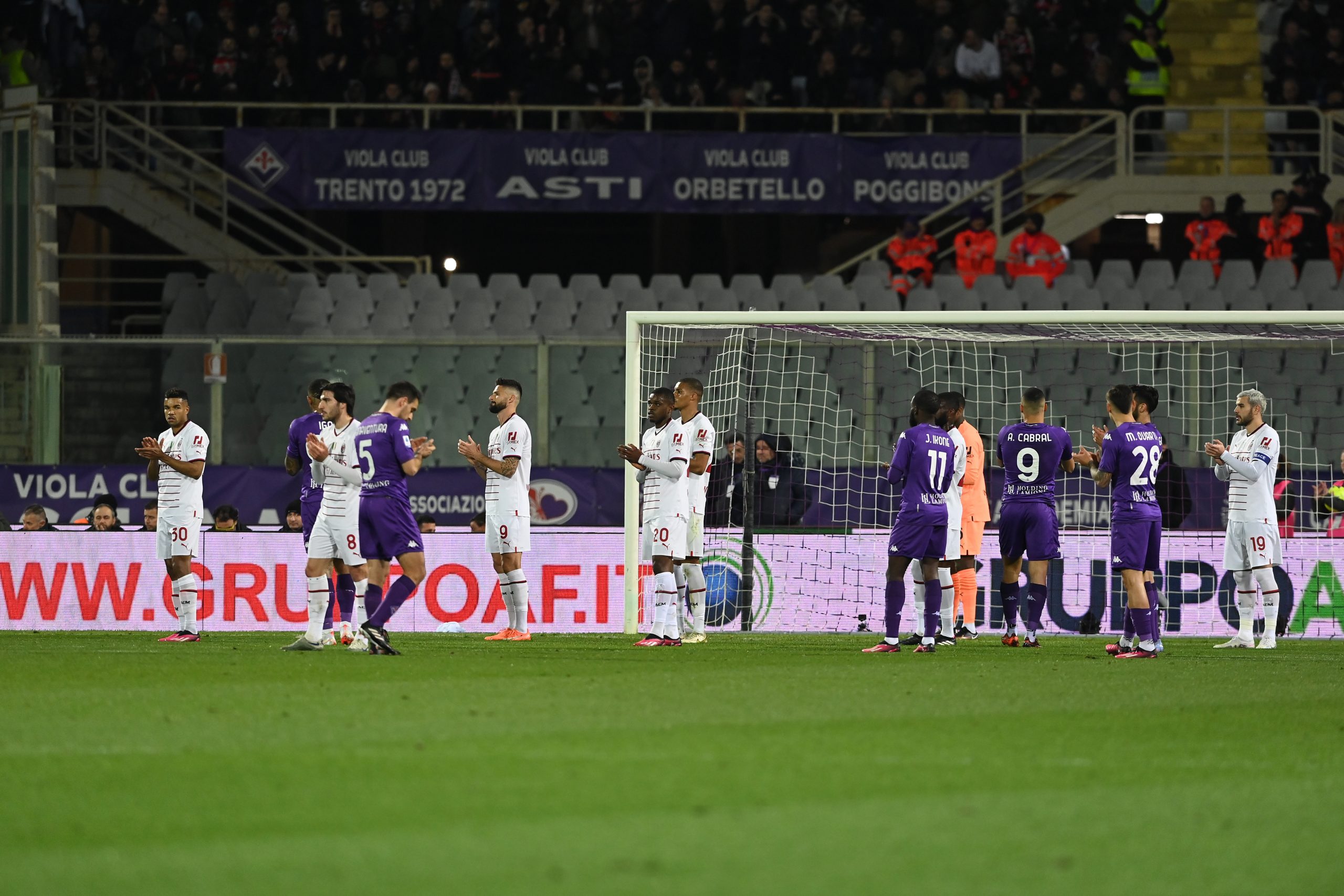 FLORENCE, ITALY - MARCH 04: Players of AC Milan and players of ACF Fiorentina observe a minute of silence in memory of Davide Astori during the Serie A match between ACF Fiorentina and AC Milan at Stadio Artemio Franchi on March 04, 2023 in Florence, Italy. (Photo by Claudio Villa/AC Milan via Getty Images)