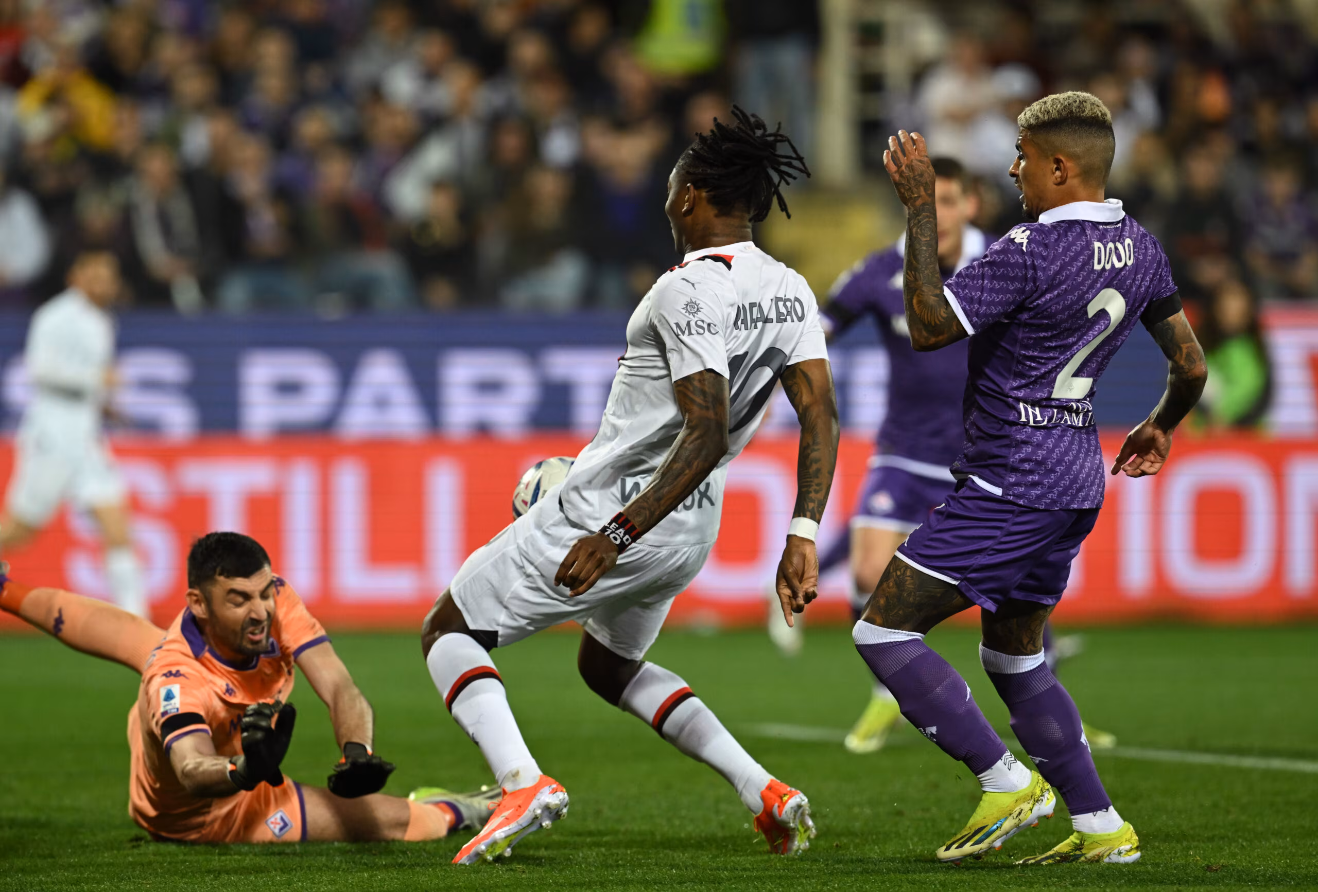 FLORENCE, ITALY - MARCH 30: Rafael Leao of AC Milan competes for the ball with Dodo of ACF Fiorentina during the Serie A TIM match between ACF Fiorentina and AC Milan at Stadio Artemio Franchi on March 30, 2024 in Florence, Italy. (Photo by Claudio Villa/AC Milan via Getty Images) (Photo by Claudio Villa/AC Milan via Getty Images)