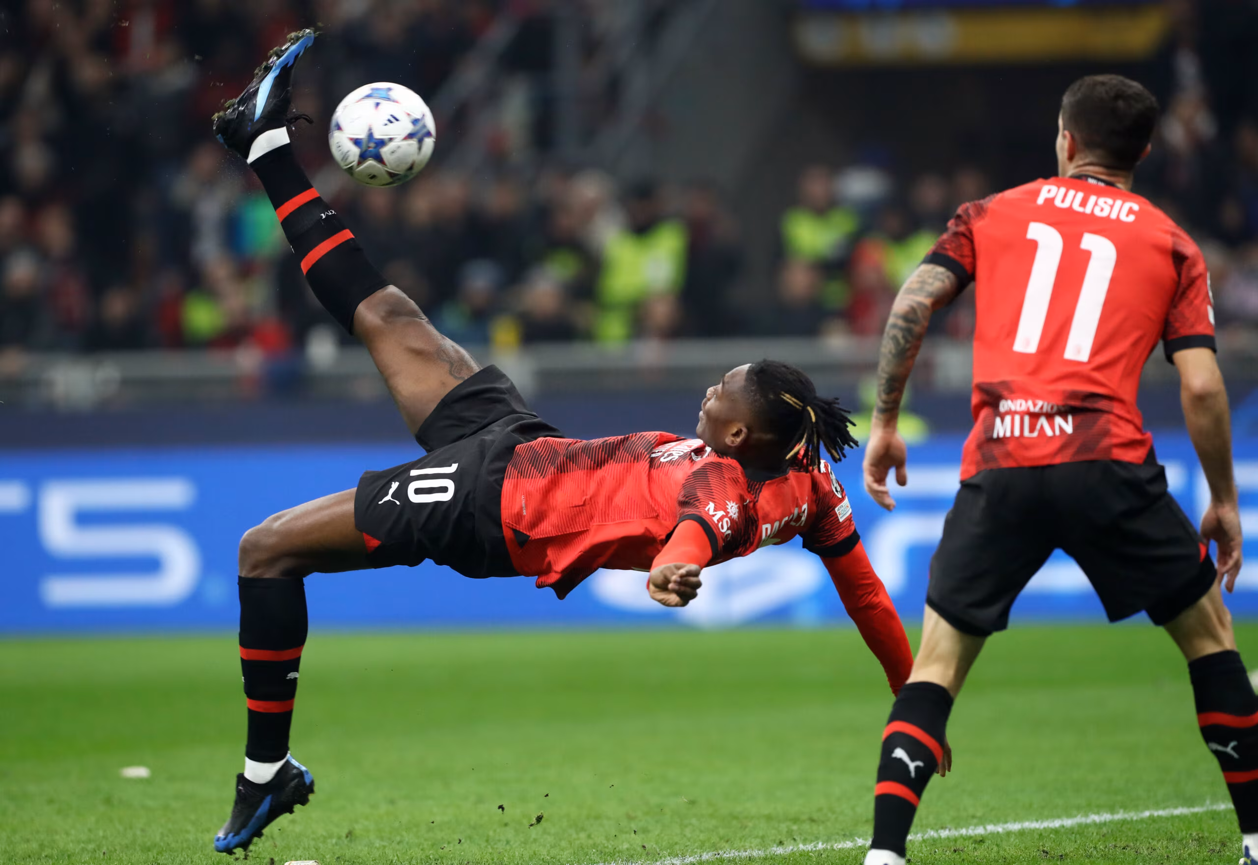 MILAN, ITALY - NOVEMBER 07: Rafael Leao of AC Milan scores the team's first goal during the UEFA Champions League match between AC Milan and Paris Saint-Germain at Stadio Giuseppe Meazza on November 07, 2023 in Milan, Italy. (Photo by Marco Luzzani/Getty Images)