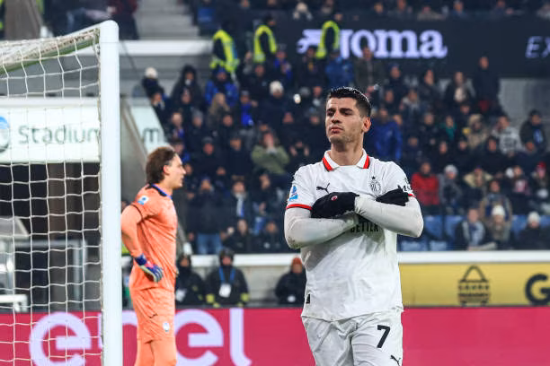 BERGAMO, ITALY - DECEMBER 06: Alvaro Morata of AC Milan celebrates after scoring the his team's first goal during the Serie A match between Atalanta and AC Milan at Gewiss Stadium on December 06, 2024 in Bergamo, Italy. (Photo by Giuseppe Cottini/Getty Images)