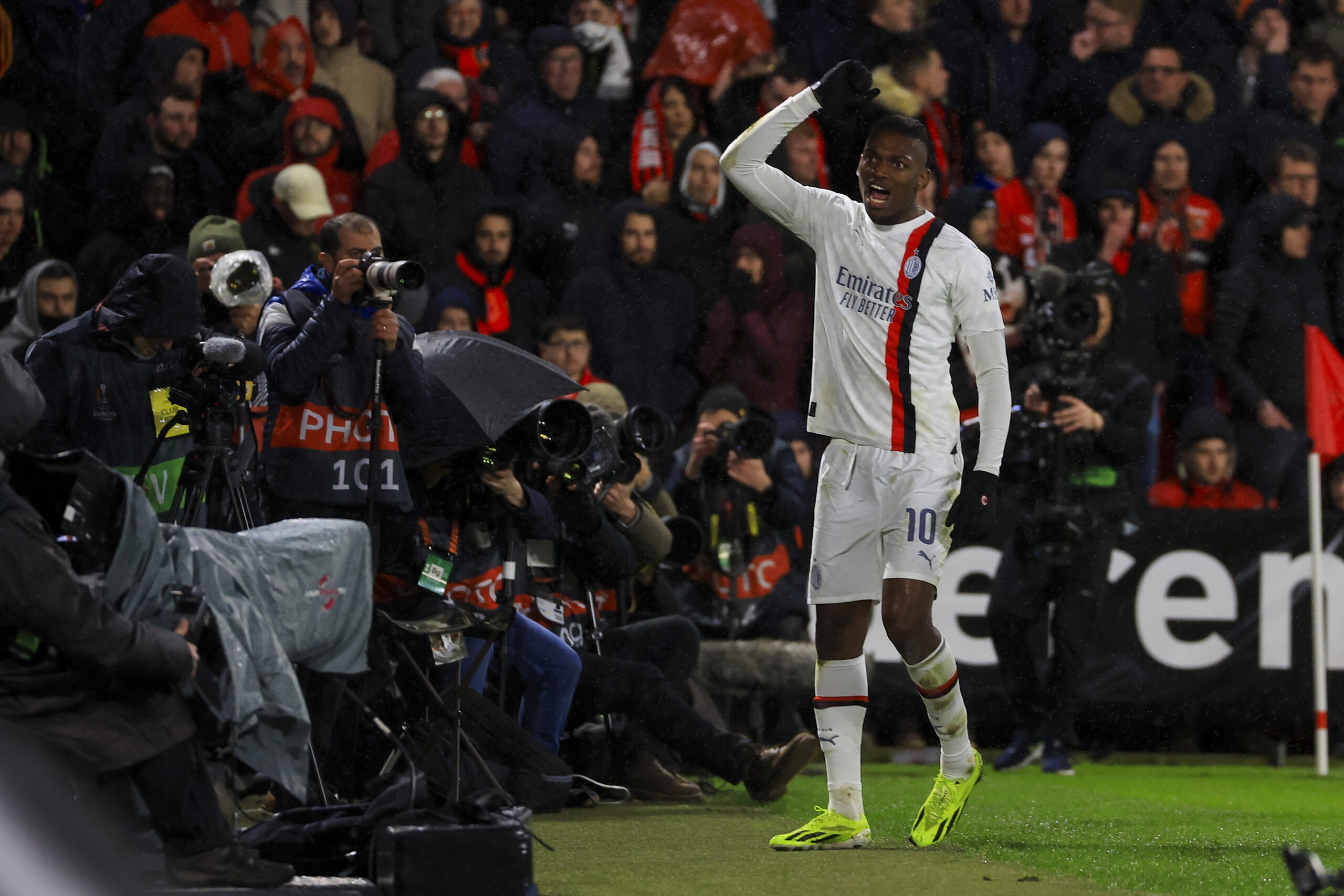RENNES, FRANCE - FEBRUARY 22: Rafael Leao of AC Milan celebrates during the UEFA Europa League 2023/24 knockout round play-offs second leg match between Stade Rennais FC and AC Milan at Roazhon Park on February 22, 2024 in Rennes, France. (Photo by Giuseppe Cottini/AC Milan via Getty Images)
